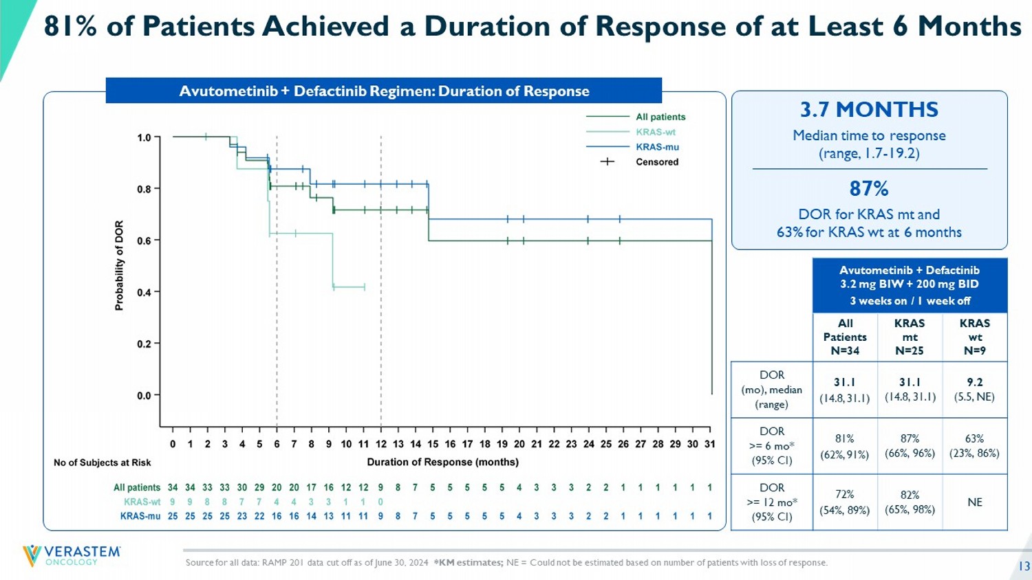 12 Avutometinib + Defactinib Regimen 3.2 mg BIW + 200 mg BID 3 weeks on / 1 week off Response Rate: Parts A, B, and C KRAS wt N=52 KRAS mt N=57 All patients N=109 9 (17) 25 (44) 34 (31) Confirmed* ORR, n (%) 0 2 (4) 2 (2) CR 9 (17) 23 (40) 32 (29) PR 34 (65) 28 (49) 62 (57) SD † , n (%) 7 (13) 2 (4) 9 (8) PD, n (%) 2 (4) 2 (4) 4 (4) Not Evaluable, n (%) Source for all data: RAMP 201 data cut off as of June 30, 2024 ; * By RECIST 1.1 Objective Response by BICR: blinded independ ent central review 9primary endpoint); Includes Unconfirmed PR; SD (or unconfirmed PR) must occur at least 53 days after first dose date; ‡ PD, progressive disease; PR, partial response; SD, stable disease. • Overall: 31% ORR in all evaluable patients • 44% ORR in KRAS mt and 17% ORR in KRAS wt Mature Data from RAMP 201 Continues to Show Robust Responses Efficacy evaluable population includes patients who received at least one dose of study drug and had measurable disease at ba sel ine by BICR. Patients not evaluable for response did not have a postbaseline assessment but are included in the denominator for the effica cy evaluable population.