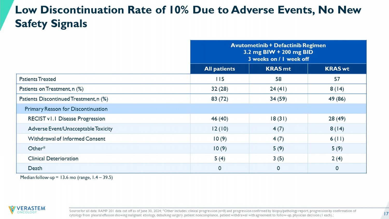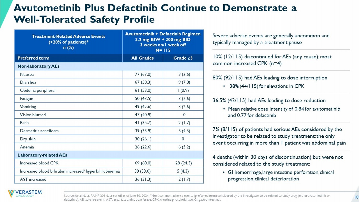 17 Median follow - up = 13.6 mo (range, 1.4 – 39.5) Source for all data: RAMP 201 data cut off as of June 30, 2024; *Other includes: clinical progression (n=8) and progression c onf irmed by biopsy/pathology report, progression by confirmation of cytology from pleural effusion showing malignant etiology, debulking surgery, patient noncompliance, patient withdrawal with agr eement to follow - up, physician decision (1 each).; Low Discontinuation Rate of 10% Due to Adverse Events, No New Safety Signals Avutometinib + Defactinib Regimen 3.2 mg BIW + 200 mg BID 3 weeks on / 1 week off KRAS wt KRAS mt All patients 57 58 115 Patients Treated 8 (14) 24 (41) 32 (28) Patients on Treatment, n (%) 49 (86) 34 (59) 83 (72) Patients Discontinued Treatment, n (%) Primary Reason for Discontinuation 28 (49) 18 (31) 46 (40) RECIST v1.1 Disease Progression 8 (14) 4 (7) 12 (10) Adverse Event/Unacceptable Toxicity 6 (11) 4 (7) 10 (9) Withdrawal of Informed Consent 5 (9) 5 (9) 10 (9) Other* 2 (4) 3 (5) 5 (4) Clinical Deterioration 0 0 0 Death