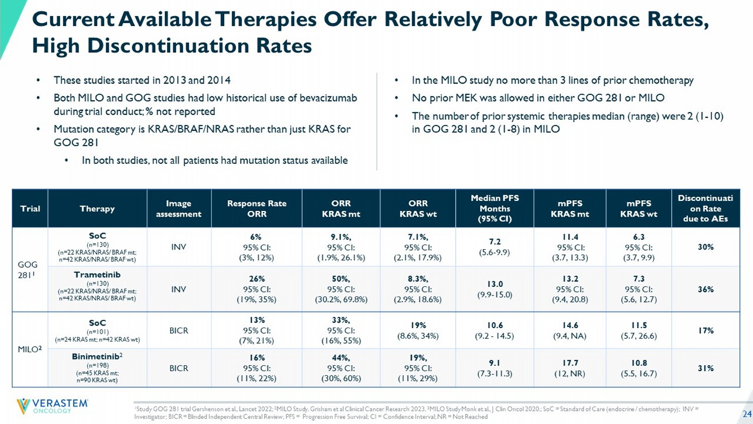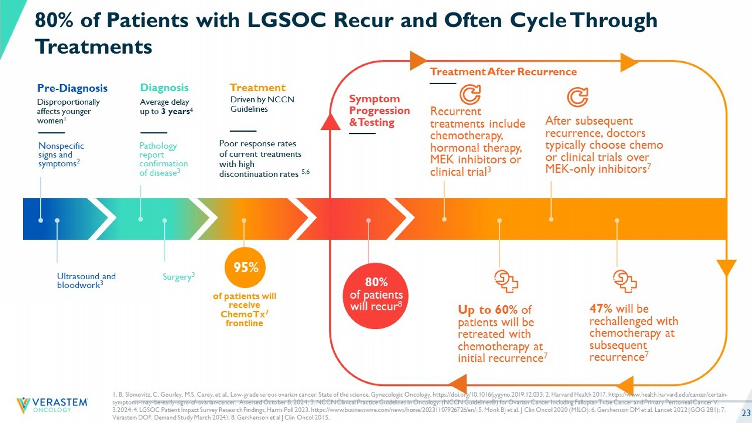 23 Disproportionally affects younger women 1 Pre - Diagnosis Nonspecific signs and symptoms 2 Ultrasound and bloodwork 3 Average delay up to 3 years 4 Diagnosis Poor r esponse rates of current treatments w ith high discontinuation rates 5,6 Treatment Symptom Progression & Testing Treatment A fter Recurrence Pathology report confirmation of disease 3 Surgery 3 of patients will receive ChemoTx 7 frontline 95% Recurrent treatments include chemotherapy, hormonal therapy, MEK inhibitors or clinical trial 3 Up to 60% of patients will be retreated with chemotherapy at initial recurrence 7 After subsequent recurrence, doctors typically choose chemo or clinical trials over MEK - only inhibitors 7 47% will be rechallenged with chemotherapy at subsequent recurrence 7 80% of Patients with LGSOC Recur and Often Cycle Through Treatments &UHDWHGE\5DQDK3L[HO6WXGLR IURPWKH1RXQ3URMHFW 80% of patients will recur 8 Driven by NCCN Guidelines 1. B. Slomovitz , C. Gourley, M.S. Carey, et al., Low - grade serous ovarian cancer: State of the science, Gynecologic Oncology, https://doi.org/1 0.1016/j.ygyno.2019.12.033; 2. Harvard Health 2017. https://www.health.harvard.edu/cancer/certain - symptoms - may - be - early - signs - of - ovarian - cancer. Assessed October 8, 2024; 3. NCCN Clinical Practice Guidelines in Oncology: (NCCN Guidelines®) for Ovarian Cancer Including Fallopian Tube Cancer and Primary Peritoneal Cancer V. 3.2024; 4. LGSOC Patient Impact Survey Research Findings, Harris Poll 2023. https://www.businesswire.com/news/home/2023110792 672 6/en/ ; 5. Monk BJ et al. J Clin Oncol 2020 (MILO); 6. Gershenson DM et al. Lancet 2022 (GOG 281); 7. Verastem DOF. Demand Study March 2024. \ ; 8. Gershenson et al J Clin Oncol 2015.