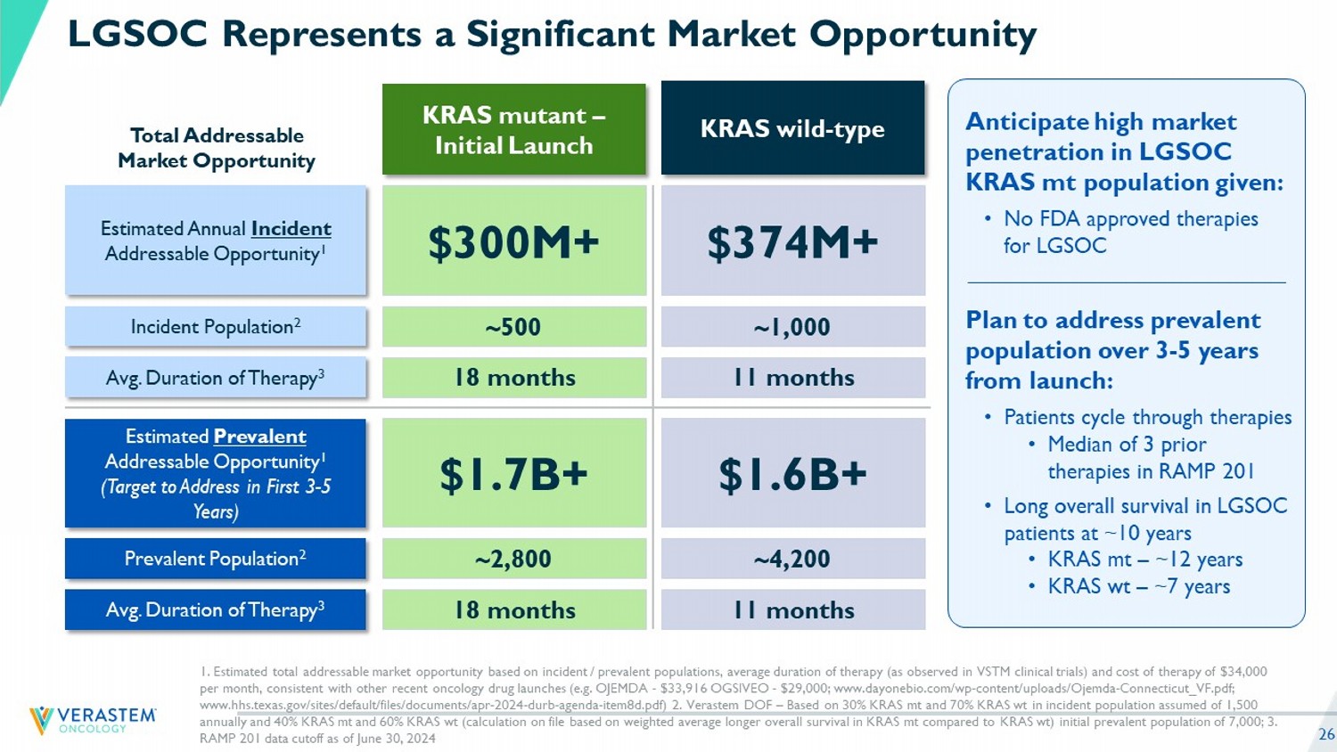 2 Forward - Looking Statements This presentation includes forward - looking statements about, among other things, Verastem Oncology’s (the “Company”) programs an d product candidates, strategy, future plans and prospects, including statements related to the scope and expecting timing for the completion of the NDA submission for the avutometinib and defactinib combination in LGSOC, the o ngo ing discussions with the FDA and the ability to obtain Accelerated Approval and Priority Review of the mature RAMP 201 data, the potential of the combination of avutometinib and defactinib to change the way patients with recurre nt LGSOC are treated, the status of enrollments for and potential of the results of the RAMP 301 Phase 3 trial to expand the indication regardless of KRAS mutation status, the structure of our planned and pending clinical trials, the potential clinical value of various of the Company's clinical trials, including the RAMP 201, RAMP 205 and RAMP 301 trials, the timing of commencing and completing trials, including topline data reports, interactions with regulators, the ti meline and indications for clinical development, regulatory submissions, the potential for and timing of commercialization of product candidates and the potential market opportunities of, and estimated addressable markets for, our dr ug candidates. The words "anticipate," "believe," "estimate," "expect," "intend," "may," "plan," "predict," "project," "target," "potential," "will," "would," "could," "should," "continue," “can,” “promising” and similar expressions are intended to identify forward - looking statements, although not all forward - looking statements contain these identifying words. Each forward - looking statement is subject to risks and uncertainties that could cause actual results to diffe r materially from those expressed or implied in such statement. Applicable risks and uncertainties include the risks and uncertainties, among other things, regarding: the success in the dev elo pment and potential commercialization of our product candidates, including avutometinib in combination with other compounds, including defactinib, LUMAKRAS and others; the uncertainties inherent in research and development, such as n ega tive or unexpected results of clinical trials, the occurrence or timing of applications for our product candidates that may be filed with regulatory authorities in any jurisdictions; whether and when regulatory authorities in any ju risdictions may approve any such applications that may be filed for our product candidates, and, if approved, whether our product candidates will be commercially successful in such jurisdictions; our ability to obtain, maintain and enf orc e patent and other intellectual property protection for our product candidates; the scope, timing, and outcome of any legal proceedings; decisions by regulatory authorities regarding trial design, labeling and other matters that could a ffe ct the timing, availability or commercial potential of our product candidates; whether preclinical testing of our product candidates and preliminary or interim data from clinical trials will be predictive of the results or success of ongoi ng or later clinical trials; that the timing, scope and rate of reimbursement for our product candidates is uncertain; that the market opportunities of our drug candidates are based on internal and third - party estimates which may prove to be incor rect; that third - party payors (including government agencies) may not reimburse; that there may be competitive developments affecting our product candidates; that data may not be available when expected; that enrollment of c lin ical trials may take longer than expected, which may delay our development programs, including delays in submission or review by the FDA of our NDA submission in recurrent KRAS mutant LGSOC if enrollment in our confirmatory trial is not well underway at the time of submission or that the FDA may require the company to enroll additional patients in the Company's ongoing RAMP 301 confirmatory Phase 3 clinical trial prior to Verastem submitting or the FD A taking action on our NDA seeking accelerated approval; risks associated with preliminary and interim data, which may not be representative of more mature data, including with respect to interim duration of therapy data; that o ur product candidates will cause adverse safety events and/or unexpected concerns may arise from additional data or analysis, or result in unmanageable safety profiles as compared to their levels of efficacy; that we may be unable to su ccessfully validate, develop and obtain regulatory approval for companion diagnostic tests for our product candidates that require or would commercially benefit from such tests, or experience significant delays in doing so; that the ma ture RAMP 201 data and associated discussions with the FDA may not support the scope of our rolling NDA submission for the avutometinib and defactinib combination in LGSOC, including with respect to KRAS wild type LGSOC; that our pr oduct candidates may experience manufacturing or supply interruptions or failures; that any of our third - party contract research organizations, contract manufacturing organizations, clinical sites, or contractors, among others, who we rely on fail to fully perform; that we face substantial competition, which may result in others developing or commercializing products before or more successfully than we do which could result in reduced market share or m ark et potential for our product candidates; that we will be unable to successfully initiate or complete the clinical development and eventual commercialization of our product candidates; that the development and commercialization of our product candidates will take longer or cost more than planned, including as a result of conducting additional studies or our decisions regarding execution of such commercialization; that we may not have sufficient cash t