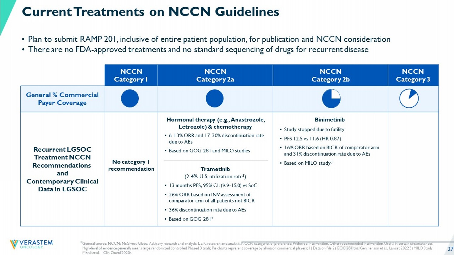 26 LGSOC Represents a Significant Market Opportunity 1. Estimated total addressable market opportunity based on incident / prevalent populations, average duration of therapy (as obs erved in VSTM clinical trials) and cost of therapy of $34,000 per month, consistent with other recent oncology drug launches (e.g. OJEMDA - $33,916 OGSIVEO - $29,000; www.dayonebio.com/wp - co ntent/uploads/Ojemda - Connecticut_VF.pdf; www.hhs.texas.gov/sites/default/files/documents/apr - 2024 - durb - agenda - item8d.pdf) 2. Verastem DOF – Based on 30% KRAS mt and 70% KRAS wt in incident population assumed of 1,500 annually and 40% KRAS mt and 60% KRAS wt (calculation on file based on weighted average longer overall survival in KRAS mt compared to KRAS wt ) initial prevalent population of 7,000; 3. RAMP 201 data cutoff as of June 30, 2 024 KRAS mutant – Initial Launch KRAS wild - type Estimated Prevalent Addressable Opportunity 1 (Target to Address in First 3 - 5 Years) Prevalent Population 2 Avg. Duration of Therapy 3 Estimated Annual Incident Addressable Opportunity 1 Incident Population 2 Avg. Duration of Therapy 3 $1.7B+ $1.6B+ ~2,800 ~4,200 18 months 11 months $300M+ $374M+ ~500 ~1,000 18 months 11 months Total Addressable Market Opportunity Anticipate high market penetration in LGSOC KRAS mt population given: • No FDA approved therapies for LGSOC Plan to address prevalent population over 3 - 5 years from launch: • Patients cycle through therapies • Median of 3 prior therapies in RAMP 201 • Long overall survival in LGSOC patients at ~10 years • KRAS mt – ~12 years • KRAS wt – ~7 years