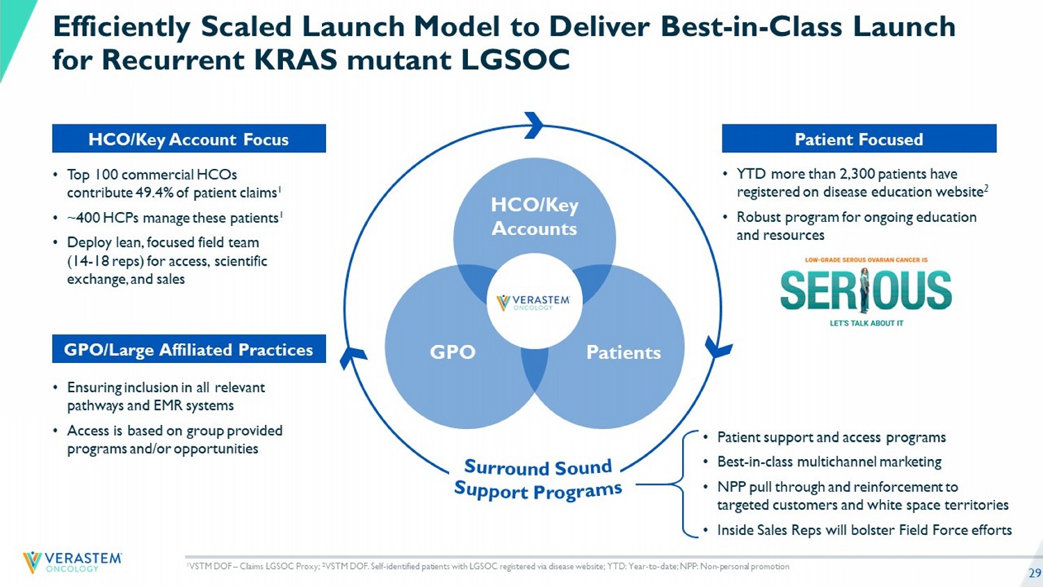 28 LGSOC Represents a Significant Market Opportunity 1. Estimated total addressable market opportunity based on incident / prevalent populations, average duration of therapy (as obs erved in VSTM clinical trials) and cost of therapy of $34,000 per month, consistent with other recent oncology drug launches (e.g. OJEMDA - $33,916 OGSIVEO - $29,000; www.dayonebio.com/wp - co ntent/uploads/Ojemda - Connecticut_VF.pdf; www.hhs.texas.gov/sites/default/files/documents/apr - 2024 - durb - agenda - item8d.pdf) 2. Verastem DOF – Based on 30% KRAS mt and 70% KRAS wt in incident population assumed of 1,500 annually and 40% KRAS mt and 60% KRAS wt (calculation on file based on weighted average longer overall survival in KRAS mt compared to KRAS wt ) initial prevalent population of 7,000; 3. RAMP 201 data cutoff as of June 30, 2 024 KRAS mutant – Initial Launch KRAS wild - type Estimated Prevalent Addressable Opportunity 1 (Target to Address in First 3 - 5 Years) Prevalent Population 2 Avg. Duration of Therapy 3 Estimated Annual Incident Addressable Opportunity 1 Incident Population 2 Avg. Duration of Therapy 3 $1.7B+ $1.6B+ ~2,800 ~4,200 18 months 11 months $300M+ $374M+ ~500 ~1,000 18 months 11 months Total Addressable Market Opportunity Anticipate high market penetration in LGSOC KRAS mt population given: • No FDA approved therapies for LGSOC Plan to address prevalent population over 3 - 5 years from launch: • Patients cycle through therapies • Median of 3 prior therapies in RAMP 201 • Long overall survival in LGSOC patients at ~10 years • KRAS mt – ~12 years • KRAS wt – ~7 years