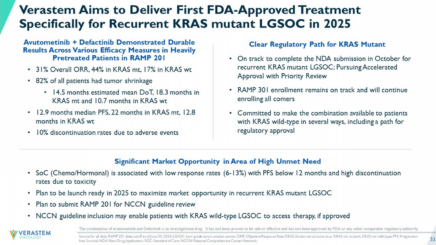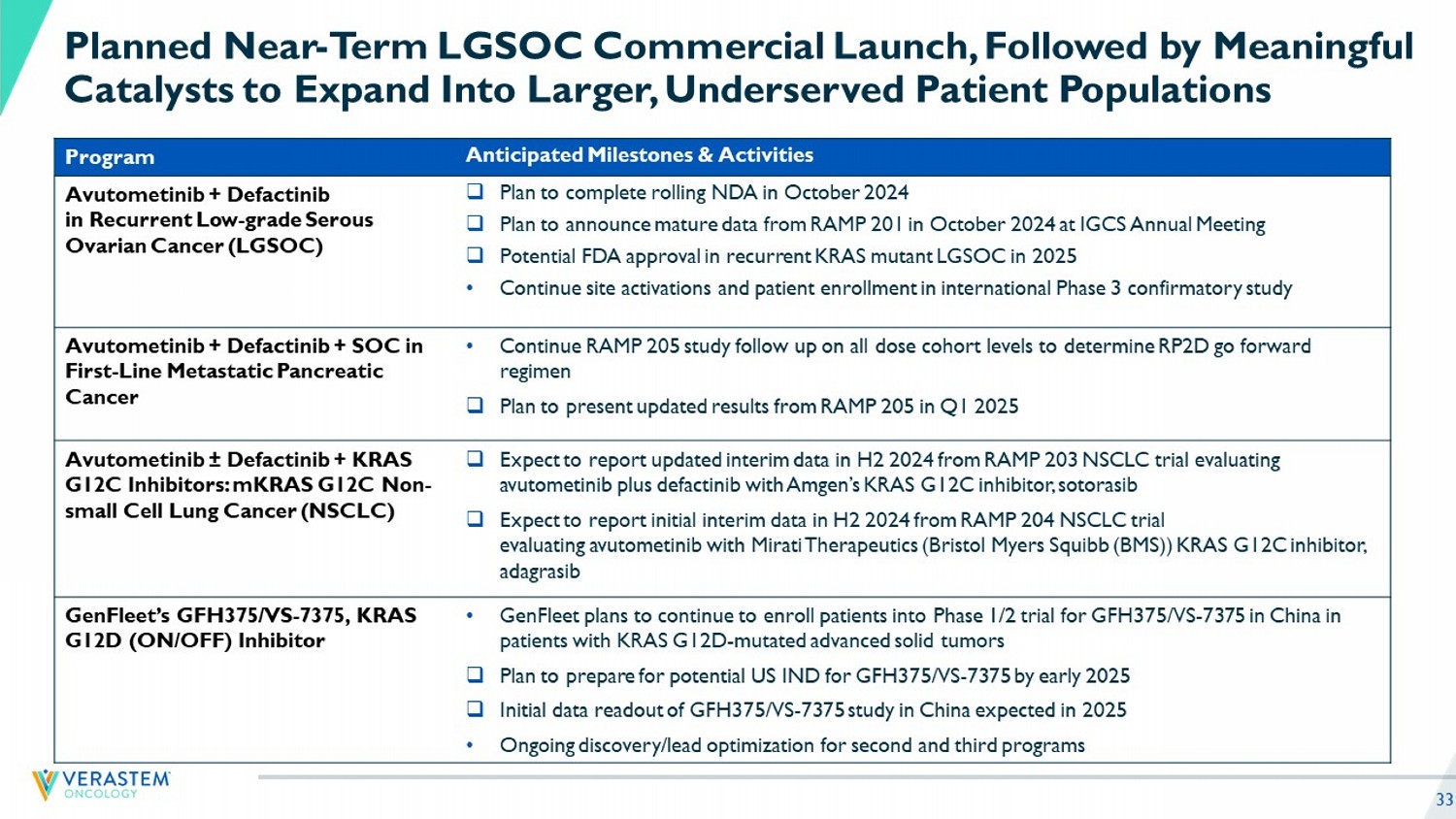 32 Avutometinib + Defactinib Demonstrated Durable Results Across Various Efficacy Measures in Heavily Pretreated Patients in RAMP 201 • 31% Overall ORR, 44% in KRAS mt, 17% in KRAS wt • 82% of all patients had tumor shrinkage • 14.5 months estimated mean DoT, 18.3 months in KRAS mt and 10.7 months in KRAS wt • 12.9 months median PFS, 22 months in KRAS mt, 12.8 months in KRAS wt • 10% discontinuation rates due to adverse events Clear Regulatory Path for KRAS Mutant • On track to complete the NDA submission in October for recurrent KRAS mutant LGSOC; Pursuing Accelerated Approval with Priority Review • RAMP 301 enrollment remains on track and will continue enrolling all comers • Committed to make the combination available to patients with KRAS wild - type in several ways, including a path for regulatory approval Verastem Aims to Deliver First FDA - Approved Treatment Specifically for Recurrent KRAS mutant LGSOC in 2025 Significant Market Opportunity in Area of High Unmet Need • SoC (Chemo/Hormonal) is associated with low response rates (6 - 13%) with PFS below 12 months and high discontinuation rates due to toxicity • Plan to be launch ready in 2025 to maximize market opportunity in recurrent KRAS mutant LGSOC • Plan to submit RAMP 201 for NCCN guideline review • NCCN guideline inclusion may enable patients with KRAS wild - type LGSOC to access therapy, if approved Source for all data: RAMP 201 data cut off as of June 30, 2024; LGSOC: Low - grade serous ovarian cancer; ORR: Objective Response Rate; KRAS, kirsten rat sarcoma virus; KRAS mt: mutant; KRAS wt : wild - type; PFS: Progression - free Survival; NDA: New Drug Application; SOC: Standard of Care; NCCN: National Comprehensive Cancer Network; The combination of Avutometinib and Defactinib is an investigational drug. It has not been proven to be safe or effective and h as not been approved by FDA or any other comparable regulatory authority.