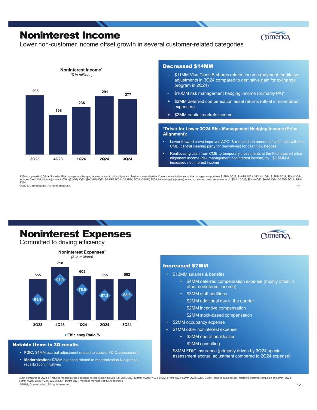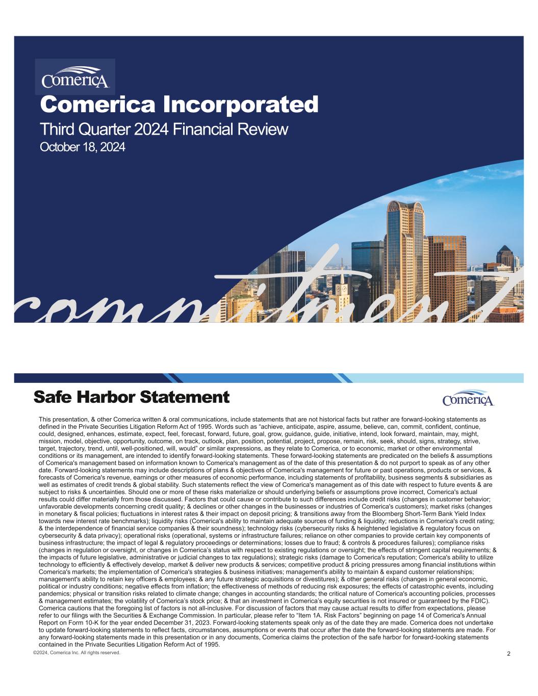 Comerica Incorporated Third Quarter 2024 Financial Review October 18, 2024 This presentation, & other Comerica written & oral communications, include statements that are not historical facts but rather are forward-looking statements as defined in the Private Securities Litigation Reform Act of 1995. Words such as “achieve, anticipate, aspire, assume, believe, can, commit, confident, continue, could, designed, enhances, estimate, expect, feel, forecast, forward, future, goal, grow, guidance, guide, initiative, intend, look forward, maintain, may, might, mission, model, objective, opportunity, outcome, on track, outlook, plan, position, potential, project, propose, remain, risk, seek, should, signs, strategy, strive, target, trajectory, trend, until, well-positioned, will, would” or similar expressions, as they relate to Comerica, or to economic, market or other environmental conditions or its management, are intended to identify forward-looking statements. These forward-looking statements are predicated on the beliefs & assumptions of Comerica's management based on information known to Comerica's management as of the date of this presentation & do not purport to speak as of any other date. Forward-looking statements may include descriptions of plans & objectives of Comerica's management for future or past operations, products or services, & forecasts of Comerica's revenue, earnings or other measures of economic performance, including statements of profitability, business segments & subsidiaries as well as estimates of credit trends & global stability. Such statements reflect the view of Comerica's management as of this date with respect to future events & are subject to risks & uncertainties. Should one or more of these risks materialize or should underlying beliefs or assumptions prove incorrect, Comerica's actual results could differ materially from those discussed. Factors that could cause or contribute to such differences include credit risks (changes in customer behavior; unfavorable developments concerning credit quality; & declines or other changes in the businesses or industries of Comerica's customers); market risks (changes in monetary & fiscal policies; fluctuations in interest rates & their impact on deposit pricing; & transitions away from the Bloomberg Short-Term Bank Yield Index towards new interest rate benchmarks); liquidity risks (Comerica's ability to maintain adequate sources of funding & liquidity; reductions in Comerica's credit rating; & the interdependence of financial service companies & their soundness); technology risks (cybersecurity risks & heightened legislative & regulatory focus on cybersecurity & data privacy); operational risks (operational, systems or infrastructure failures; reliance on other companies to provide certain key components of business infrastructure; the impact of legal & regulatory proceedings or determinations; losses due to fraud; & controls & procedures failures); compliance risks (changes in regulation or oversight, or changes in Comerica’s status with respect to existing regulations or oversight; the effects of stringent capital requirements; & the impacts of future legislative, administrative or judicial changes to tax regulations); strategic risks (damage to Comerica's reputation; Comerica's ability to utilize technology to efficiently & effectively develop, market & deliver new products & services; competitive product & pricing pressures among financial institutions within Comerica's markets; the implementation of Comerica's strategies & business initiatives; management's ability to maintain & expand customer relationships; management's ability to retain key officers & employees; & any future strategic acquisitions or divestitures); & other general risks (changes in general economic, political or industry conditions; negative effects from inflation; the effectiveness of methods of reducing risk exposures; the effects of catastrophic events, including pandemics; physical or transition risks related to climate change; changes in accounting standards; the critical nature of Comerica's accounting policies, processes & management estimates; the volatility of Comerica’s stock price; & that an investment in Comerica’s equity securities is not insured or guaranteed by the FDIC). Comerica cautions that the foregoing list of factors is not all-inclusive. For discussion of factors that may cause actual results to differ from expectations, please refer to our filings with the Securities & Exchange Commission. In particular, please refer to “Item 1A. Risk Factors” beginning on page 14 of Comerica's Annual Report on Form 10-K for the year ended December 31, 2023. Forward-looking statements speak only as of the date they are made. Comerica does not undertake to update forward-looking statements to reflect facts, circumstances, assumptions or events that occur after the date the forward-looking statements are made. For any forward-looking statements made in this presentation or in any documents, Comerica claims the protection of the safe harbor for forward-looking statements contained in the Private Securities Litigation Reform Act of 1995. Safe Harbor Statement 2©2024, Comerica Inc. All rights reserved.