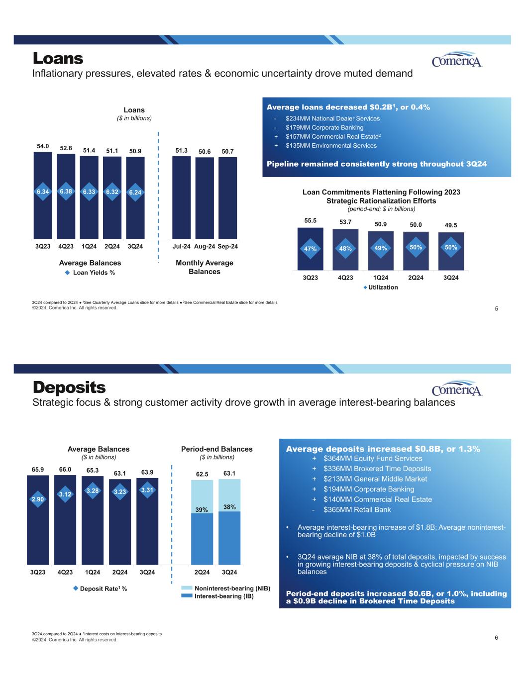 3©2024, Comerica Inc. All rights reserved. Celebrated Comerica’s 175th Anniversary 3Q24 Review Leveraging our strong legacy & investing in a promising future Strong Average Deposits ($ in billions) Growth in Tangible Book Value1 (per share; period-end) Positive Net Interest Income Trends ($ in millions) Consistently Low Net Charge-Offs (% of total loans) 0.09% 0.08% 2Q24 3Q24 3Q24 Financial Highlights $533 $534 2Q24 3Q24 1% 23% 0.2% 1Refer to reconciliation of non-GAAP financial measures in appendix 2Refer to slide 21 for more information relating to BSBY +1.3% in 3Q ex. BSBY2 $63.1 $63.9 2Q24 3Q24 $38.65 $47.69 2Q24 3Q24 3Q24 Results Favorable deposit & net interest income trends, prudent credit discipline & increasingly strong capital position 1Includes gains/(losses) related to deferred comp asset returns of $(3MM) 3Q23, $0.5MM 2Q24, $4MM 3Q24 in noninterest income & $(2MM) 3Q23, $2MM 2Q24, $6MM 3Q24 in noninterest expense 2Diluted earnings per common share 3Refer to reconciliation of non-GAAP financial measures in appendix 4Noninterest expenses as a percentage of the sum of net interest income & noninterest income excluding net gains (losses) from securities, a derivative contract tied to the conversion rate of Visa Class B shares & changes in the value of shares obtained through monetization of warrants 53Q24 estimated (millions, except per share data) 3Q24 2Q24 3Q23 Change From 2Q24 3Q23 Average loans $50,861 $51,071 $53,987 $(210) $(3,126) Average deposits 63,896 63,055 65,883 841 (1,987) Net interest income 534 533 601 1 (67) Provision for credit losses 14 -- 14 14 -- Noninterest income1 277 291 295 (14) (18) Noninterest expenses1 562 555 555 7 7 Provision for income tax 51 63 76 (12) (25) Net income 184 206 251 (22) (67) Earnings per share2 $1.33 $1.49 $1.84 $(0.16) $(0.51) Adjusted Earnings per share2,3 1.37 1.53 1.76 $(0.16) $(0.39) Efficiency Ratio4 68.80% 67.77% 61.86% CET15 11.97% 11.55% 10.80% Key Performance Drivers 3Q24 compared to 2Q24 • Average loans decreased modestly, driven primarily by decline in National Dealer Services • 1.3% growth in average deposits with increases across most business lines • Reported net interest income up slightly; excluding the impact from BSBY cessation, net interest income grew $7MM with higher Fed balances & strong customer deposits offsetting lower loans; net interest margin decreased 6bps • Low net charge-offs of 8 bps; reserve ratio increased to 1.43% reflecting lower loan balances & relatively consistent credit trends • Noninterest income negatively impacted by noncustomer income, largely Visa Class B share related income & lower risk management hedging income due to shift in forward curve (offset in net interest income) • Noninterest expenses well managed with higher salaries & benefits offsetting lower FDIC expense reflecting special assessment accrual adjustment • Conservative approach to capital; maintained CET1 well above our 10% strategic target 4©2024, Comerica Inc. All rights reserved.