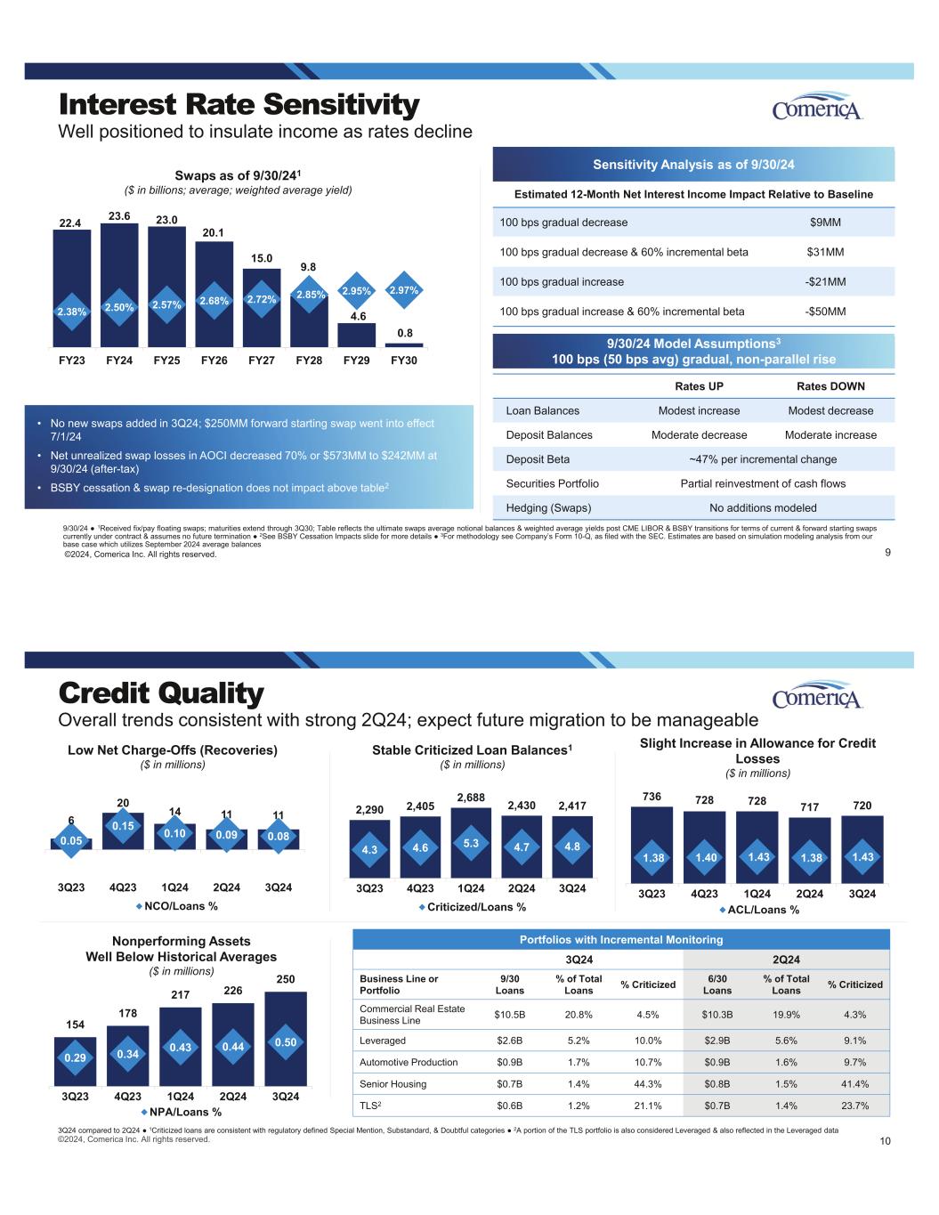 Interest Rate Sensitivity Well positioned to insulate income as rates decline 9/30/24 1Received fix/pay floating swaps; maturities extend through 3Q30; Table reflects the ultimate swaps average notional balances & weighted average yields post CME LIBOR & BSBY transitions for terms of current & forward starting swaps currently under contract & assumes no future termination 2See BSBY Cessation Impacts slide for more details 3For methodology see Company’s Form 10-Q, as filed with the SEC. Estimates are based on simulation modeling analysis from our base case which utilizes September 2024 average balances 9©2024, Comerica Inc. All rights reserved. Swaps as of 9/30/241 ($ in billions; average; weighted average yield) • No new swaps added in 3Q24; $250MM forward starting swap went into effect 7/1/24 • Net unrealized swap losses in AOCI decreased 70% or $573MM to $242MM at 9/30/24 (after-tax) • BSBY cessation & swap re-designation does not impact above table2 Estimated 12-Month Net Interest Income Impact Relative to Baseline 100 bps gradual decrease $9MM 100 bps gradual decrease & 60% incremental beta $31MM 100 bps gradual increase -$21MM 100 bps gradual increase & 60% incremental beta -$50MM Sensitivity Analysis as of 9/30/24 Rates UP Rates DOWN Loan Balances Modest increase Modest decrease Deposit Balances Moderate decrease Moderate increase Deposit Beta ~47% per incremental change Securities Portfolio Partial reinvestment of cash flows Hedging (Swaps) No additions modeled 9/30/24 Model Assumptions3 100 bps (50 bps avg) gradual, non-parallel rise 22.4 23.6 23.0 20.1 15.0 9.8 4.6 0.8 2.38% 2.50% 2.57% 2.68% 2.72% 2.85% 2.95% 2.97% FY23 FY24 FY25 FY26 FY27 FY28 FY29 FY30 154 178 217 226 250 0.29 0.34 0.43 0.44 0.50 (0.10) 0.10 0.30 0.50 0.70 0.90 1.10 1.30 1.50 3Q23 4Q23 1Q24 2Q24 3Q24 NPA/Loans % Credit Quality Overall trends consistent with strong 2Q24; expect future migration to be manageable 3Q24 compared to 2Q24 1Criticized loans are consistent with regulatory defined Special Mention, Substandard, & Doubtful categories 2A portion of the TLS portfolio is also considered Leveraged & also reflected in the Leveraged data Nonperforming Assets Well Below Historical Averages ($ in millions) Stable Criticized Loan Balances1 ($ in millions) 736 728 728 717 720 1.38 1.40 1.43 1.38 1.43 - 1.00 2.00 3.00 4.00 5.00 6.00 3Q23 4Q23 1Q24 2Q24 3Q24 ACL/Loans % Slight Increase in Allowance for Credit Losses ($ in millions) 2,290 2,405 2,688 2,430 2,417 4.3 4.6 5.3 4.7 4.8 - 2.00 4.00 6.00 8.00 10.00 12.00 3Q23 4Q23 1Q24 2Q24 3Q24 Criticized/Loans % 10©2024, Comerica Inc. All rights reserved. Low Net Charge-Offs (Recoveries) ($ in millions) Portfolios with Incremental Monitoring 3Q24 2Q24 Business Line or Portfolio 9/30 Loans % of Total Loans % Criticized 6/30 Loans % of Total Loans % Criticized Commercial Real Estate Business Line $10.5B 20.8% 4.5% $10.3B 19.9% 4.3% Leveraged $2.6B 5.2% 10.0% $2.9B 5.6% 9.1% Automotive Production $0.9B 1.7% 10.7% $0.9B 1.6% 9.7% Senior Housing $0.7B 1.4% 44.3% $0.8B 1.5% 41.4% TLS2 $0.6B 1.2% 21.1% $0.7B 1.4% 23.7% 6 20 14 11 11 0.05 0.15 0.10 0.09 0.08 (0.20) (0.15) (0.10) (0.05) - 0.05 0.10 0.15 0.20 0.25 0.30 3Q23 4Q23 1Q24 2Q24 3Q24 NCO/Loans %