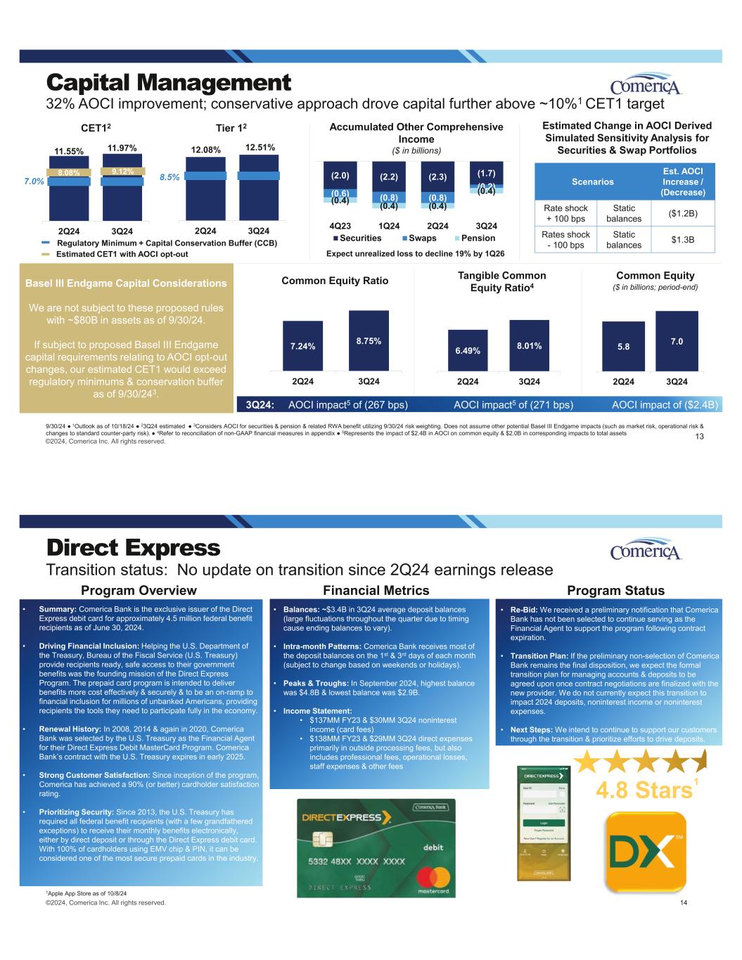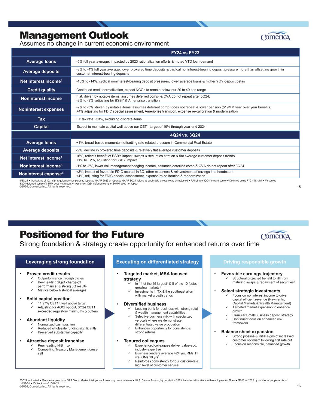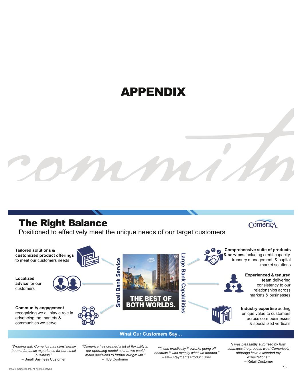 (2.0) (2.2) (2.3) (1.7) (0.6) (0.8) (0.8) (0.2) (0.4) (0.4) (0.4) (0.4) 4Q23 1Q24 2Q24 3Q24 Securities Swaps Pension 6.49% 8.01% 2Q24 3Q24 Capital Management 32% AOCI improvement; conservative approach drove capital further above ~10%1 CET1 target 9/30/24 1Outlook as of 10/18/24 23Q24 estimated 3Considers AOCI for securities & pension & related RWA benefit utilizing 9/30/24 risk weighting. Does not assume other potential Basel III Endgame impacts (such as market risk, operational risk & changes to standard counter-party risk). 4Refer to reconciliation of non-GAAP financial measures in appendix 5Represents the impact of $2.4B in AOCI on common equity & $2.0B in corresponding impacts to total assets 11.55% 11.97% 7.0% 2Q24 3Q24 CET12 Tier 12 12.08% 12.51% 8.5% 2Q24 3Q24 Regulatory Minimum + Capital Conservation Buffer (CCB) 13©2024, Comerica Inc. All rights reserved. 5.8 7.0 2Q24 3Q24 Common Equity ($ in billions; period-end) Tangible Common Equity Ratio4 7.24% 8.75% 2Q24 3Q24 Common Equity Ratio Accumulated Other Comprehensive Income ($ in billions) Scenarios Est. AOCI Increase / (Decrease) Rate shock + 100 bps Static balances ($1.2B) Rates shock - 100 bps Static balances $1.3B Estimated Change in AOCI Derived Simulated Sensitivity Analysis for Securities & Swap Portfolios 3Q24: AOCI impact5 of (267 bps) AOCI impact5 of (271 bps) AOCI impact of ($2.4B) Basel III Endgame Capital Considerations We are not subject to these proposed rules with ~$80B in assets as of 9/30/24. If subject to proposed Basel III Endgame capital requirements relating to AOCI opt-out changes, our estimated CET1 would exceed regulatory minimums & conservation buffer as of 9/30/243. 8.08% Estimated CET1 with AOCI opt-out 9.12% Expect unrealized loss to decline 19% by 1Q26 14©2024, Comerica Inc. All rights reserved. Direct Express Transition status: No update on transition since 2Q24 earnings release • Summary: Comerica Bank is the exclusive issuer of the Direct Express debit card for approximately 4.5 million federal benefit recipients as of June 30, 2024. • Driving Financial Inclusion: Helping the U.S. Department of the Treasury, Bureau of the Fiscal Service (U.S. Treasury) provide recipients ready, safe access to their government benefits was the founding mission of the Direct Express Program. The prepaid card program is intended to deliver benefits more cost effectively & securely & to be an on-ramp to financial inclusion for millions of unbanked Americans, providing recipients the tools they need to participate fully in the economy. • Renewal History: In 2008, 2014 & again in 2020, Comerica Bank was selected by the U.S. Treasury as the Financial Agent for their Direct Express Debit MasterCard Program. Comerica Bank’s contract with the U.S. Treasury expires in early 2025. • Strong Customer Satisfaction: Since inception of the program, Comerica has achieved a 90% (or better) cardholder satisfaction rating. • Prioritizing Security: Since 2013, the U.S. Treasury has required all federal benefit recipients (with a few grandfathered exceptions) to receive their monthly benefits electronically, either by direct deposit or through the Direct Express debit card. With 100% of cardholders using EMV chip & PIN, it can be considered one of the most secure prepaid cards in the industry. Program Overview Financial Metrics Program Status • Balances: ~$3.4B in 3Q24 average deposit balances (large fluctuations throughout the quarter due to timing cause ending balances to vary). • Intra-month Patterns: Comerica Bank receives most of the deposit balances on the 1st & 3rd days of each month (subject to change based on weekends or holidays). • Peaks & Troughs: In September 2024, highest balance was $4.8B & lowest balance was $2.9B. • Income Statement: • $137MM FY23 & $30MM 3Q24 noninterest income (card fees) • $138MM FY23 & $29MM 3Q24 direct expenses primarily in outside processing fees, but also includes professional fees, operational losses, staff expenses & other fees • Re-Bid: We received a preliminary notification that Comerica Bank has not been selected to continue serving as the Financial Agent to support the program following contract expiration. • Transition Plan: If the preliminary non-selection of Comerica Bank remains the final disposition, we expect the formal transition plan for managing accounts & deposits to be agreed upon once contract negotiations are finalized with the new provider. We do not currently expect this transition to impact 2024 deposits, noninterest income or noninterest expenses. • Next Steps: We intend to continue to support our customers through the transition & prioritize efforts to drive deposits. 4.8 Stars1 1Apple App Store as of 10/8/24