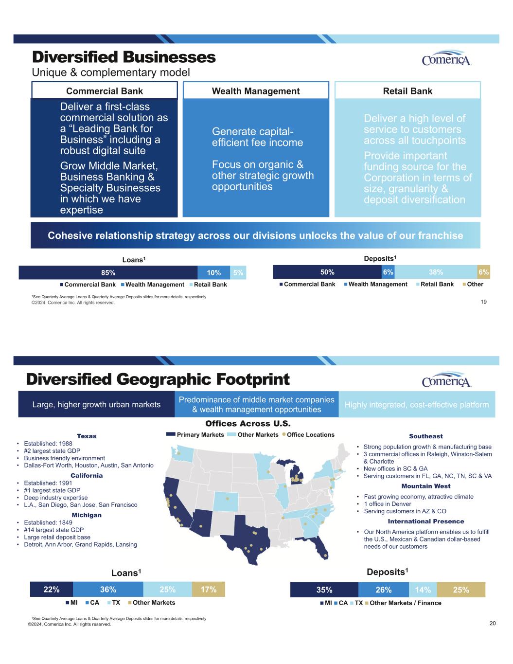APPENDIX What Our Customers Say… “Working with Comerica has consistently been a fantastic experience for our small business.” – Small Business Customer “Comerica has created a lot of flexibility in our operating model so that we could make decisions to further our growth.” – TLS Customer “It was practically fireworks going off because it was exactly what we needed.” – New Payments Product User “I was pleasantly surprised by how seamless the process was! Comerica's offerings have exceeded my expectations.” – Retail Customer ©2024, Comerica Inc. All rights reserved. The Right Balance Positioned to effectively meet the unique needs of our target customers Experienced & tenured team delivering consistency to our relationships across markets & businesses Tailored solutions & customized product offerings to meet our customers needs Localized advice for our customers Industry expertise adding unique value to customers across core businesses & specialized verticals Comprehensive suite of products & services including credit capacity, treasury management, & capital market solutions Community engagement recognizing we all play a role in advancing the markets & communities we serve Large B ank C apabilitiesSm al l B an k Se rv ic e 18