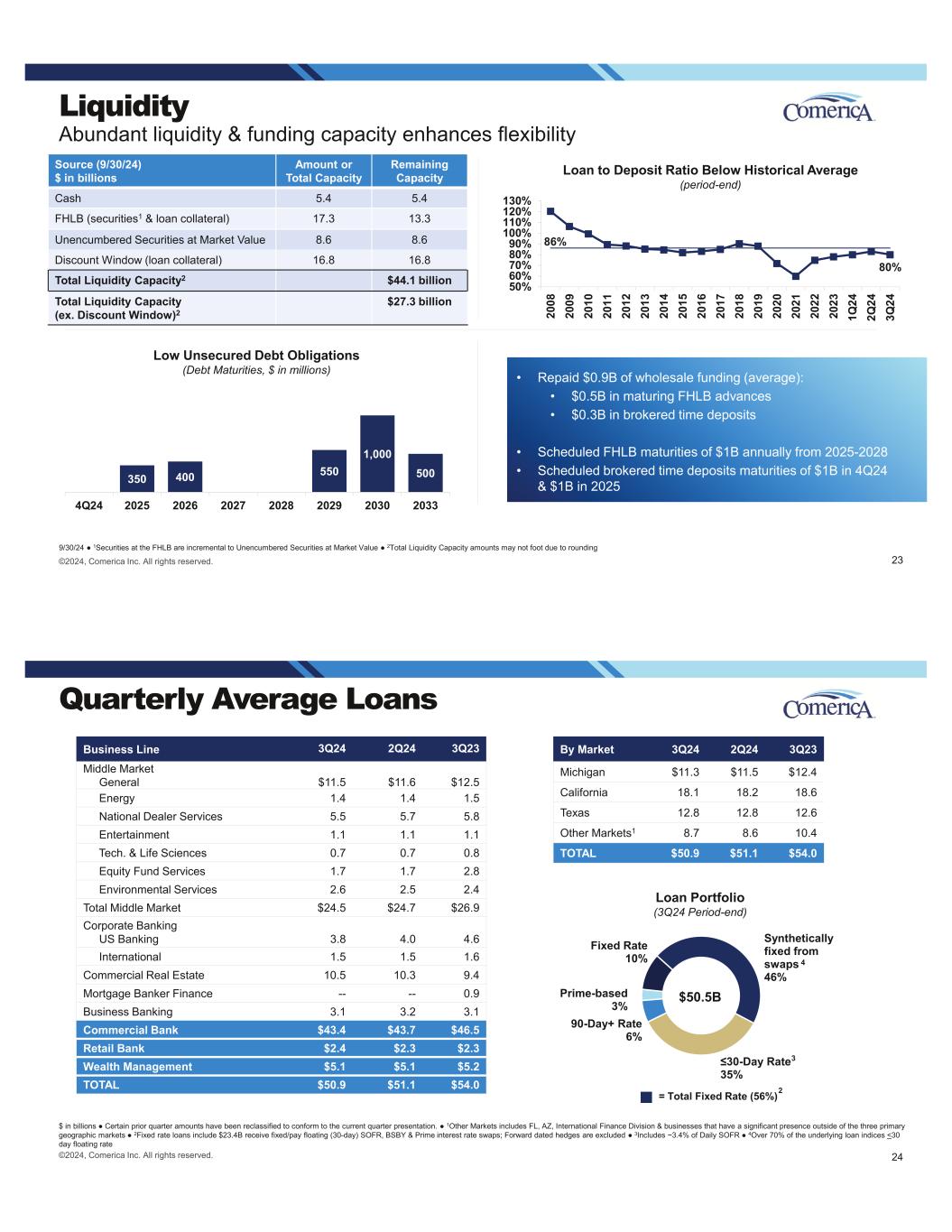 ©2024, Comerica Inc. All rights reserved. Liquidity Abundant liquidity & funding capacity enhances flexibility 9/30/24 1Securities at the FHLB are incremental to Unencumbered Securities at Market Value 2Total Liquidity Capacity amounts may not foot due to rounding 23 • Repaid $0.9B of wholesale funding (average): • $0.5B in maturing FHLB advances • $0.3B in brokered time deposits • Scheduled FHLB maturities of $1B annually from 2025-2028 • Scheduled brokered time deposits maturities of $1B in 4Q24 & $1B in 2025 Source (9/30/24) $ in billions Amount or Total Capacity Remaining Capacity Cash 5.4 5.4 FHLB (securities1 & loan collateral) 17.3 13.3 Unencumbered Securities at Market Value 8.6 8.6 Discount Window (loan collateral) 16.8 16.8 Total Liquidity Capacity2 $44.1 billion Total Liquidity Capacity (ex. Discount Window)2 $27.3 billion Low Unsecured Debt Obligations (Debt Maturities, $ in millions) 80% 86% 50% 60% 70% 80% 90% 100% 110% 120% 130% 20 08 20 09 20 10 20 11 20 12 20 13 20 14 20 15 20 16 20 17 20 18 20 19 20 20 20 21 20 22 20 23 1Q 24 2Q 24 3Q 24 Loan to Deposit Ratio Below Historical Average (period-end) 350 400 550 1,000 500 4Q24 2025 2026 2027 2028 2029 2030 2033 = Total Fixed Rate (56%) Business Line 3Q24 2Q24 3Q23 Middle Market General $11.5 $11.6 $12.5 Energy 1.4 1.4 1.5 National Dealer Services 5.5 5.7 5.8 Entertainment 1.1 1.1 1.1 Tech. & Life Sciences 0.7 0.7 0.8 Equity Fund Services 1.7 1.7 2.8 Environmental Services 2.6 2.5 2.4 Total Middle Market $24.5 $24.7 $26.9 Corporate Banking US Banking 3.8 4.0 4.6 International 1.5 1.5 1.6 Commercial Real Estate 10.5 10.3 9.4 Mortgage Banker Finance -- -- 0.9 Business Banking 3.1 3.2 3.1 Commercial Bank $43.4 $43.7 $46.5 Retail Bank $2.4 $2.3 $2.3 Wealth Management $5.1 $5.1 $5.2 TOTAL $50.9 $51.1 $54.0 Quarterly Average Loans $ in billions Certain prior quarter amounts have been reclassified to conform to the current quarter presentation. 1Other Markets includes FL, AZ, International Finance Division & businesses that have a significant presence outside of the three primary geographic markets 2Fixed rate loans include $23.4B receive fixed/pay floating (30-day) SOFR, BSBY & Prime interest rate swaps; Forward dated hedges are excluded 3Includes ~3.4% of Daily SOFR 4Over 70% of the underlying loan indices <30 day floating rate By Market 3Q24 2Q24 3Q23 Michigan $11.3 $11.5 $12.4 California 18.1 18.2 18.6 Texas 12.8 12.8 12.6 Other Markets1 8.7 8.6 10.4 TOTAL $50.9 $51.1 $54.0 ©2024, Comerica Inc. All rights reserved. 24 Fixed Rate 10% Synthetically fixed from swaps 46% -Day Rate 35% 90-Day+ Rate 6% Prime-based 3% 2 Loan Portfolio (3Q24 Period-end) 3 $50.5B 4