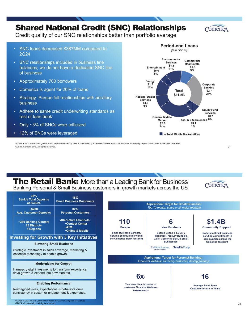 Quarterly Average Deposits $ in billions Certain prior quarter amounts have been reclassified to conform to the current quarter presentation. 1Finance/Other includes items not directly associated with the geographic markets or the three major business segments 2Other Markets includes FL, AZ, International Finance Division & businesses that have a significant presence outside of the three primary geographic markets Business Line 3Q24 2Q24 3Q23 Middle Market General $16.9 $16.7 $16.6 Energy 0.4 0.3 0.3 National Dealer Services 0.9 0.9 1.0 Entertainment 0.4 0.4 0.3 Tech. & Life Sciences 3.0 2.9 3.3 Equity Fund Services 1.1 0.8 0.9 Environmental Services 0.4 0.3 0.4 Total Middle Market $23.1 $22.3 $22.8 Corporate Banking US Banking 2.2 2.0 2.0 International 1.9 1.9 1.8 Commercial Real Estate 1.6 1.5 1.4 Mortgage Banker Finance -- -- 0.3 Business Banking 3.6 3.5 3.6 Commercial Bank $32.4 $31.2 $31.9 Retail Bank $24.2 $24.6 $24.0 Wealth Management $3.8 $4.0 $3.9 Finance / Other1 $3.5 $3.3 $6.1 TOTAL $63.9 $63.1 $65.9 By Market 3Q24 2Q24 3Q23 Michigan $22.6 $22.5 $22.5 California 16.4 16.4 16.3 Texas 9.2 9.2 9.2 Other Markets2 12.1 11.6 11.9 Finance / Other1 3.6 3.4 6.0 TOTAL $63.9 $63.1 $65.9 ©2024, Comerica Inc. All rights reserved. 25 Commercial Noninterest- bearing 27% Commercial Interest- bearing 34% Retail Interest- bearing 28% Retail Noninterest- bearing 11% Strong Deposit Mix: 38% Noninterest-bearing (3Q24 Average) Total $63.9B Commercial Bank 50%Retail Bank 38% Wealth Management 6% Other 6% Diversified Deposit Base (3Q24 average) 1Represents uninsured deposits using total deposits at the consolidated level for Comerica Inc. & subsidiaries, which is consistent with the presentation on the consolidated balance sheet, & excludes uninsured deposits eliminated in consolidation 29/30/24 is estimated 3As of 9/30/24 4Includes consumer & small business ©2024, Comerica Inc. All rights reserved. Attractive Deposit Profile Targeted focus on relationship deposits Stronger Profile than Pre-Pandemic ($ in billions) YE 2019 YE 2022 9/30/2024 Loan-to-Deposit Ratio 88% 75% 80% Total Deposits (Period-end) $57.3 $71.4 $63.1 % Uninsured Deposits Per Call Report Adjusted for Affiliate Deposits1 60% 54% 64% 57% 51%2 45%2 Stable & Tenured Core Deposit Base3 Diversified Across Markets & Businesses • Highest concentrations in Retail Consumer (29%), Middle Market Lending (13%) & Small Business Banking (9%), inherently diversified business lines • Geographically dispersed Holistic, Connected Relationships • ~91% of Commercial Bank noninterest-bearing deposits utilize Treasury Management services; ~91% have ECA • Average Middle Market relationship has 8 Treasury Management products • ~89% Retail customers have checking account4 Tenured • Average Middle Market relationship >15 years • Average Retail relationship ~16 years4 Active Operating Accounts • Average Middle Market relationship deposit balances of ~$4MM (includes ~$2MM in noninterest-bearing) • Average Retail customer checking account balance of ~$28K4 26