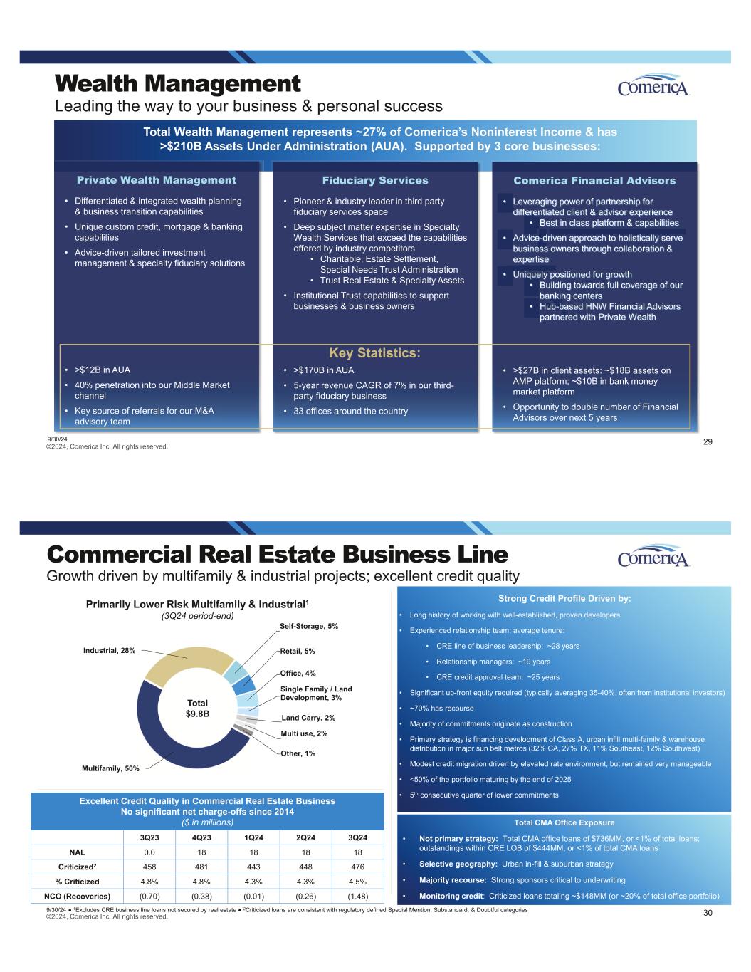 ©2024, Comerica Inc. All rights reserved. Wealth Management Leading the way to your business & personal success Fiduciary Services • Pioneer & industry leader in third party fiduciary services space • Deep subject matter expertise in Specialty Wealth Services that exceed the capabilities offered by industry competitors • Charitable, Estate Settlement, Special Needs Trust Administration • Trust Real Estate & Specialty Assets • Institutional Trust capabilities to support businesses & business owners • >$170B in AUA • 5-year revenue CAGR of 7% in our third- party fiduciary business • 33 offices around the country Private Wealth Management • Differentiated & integrated wealth planning & business transition capabilities • Unique custom credit, mortgage & banking capabilities • Advice-driven tailored investment management & specialty fiduciary solutions • >$12B in AUA • 40% penetration into our Middle Market channel • Key source of referrals for our M&A advisory team Comerica Financial Advisors • Leveraging power of partnership for differentiated client & advisor experience • Best in class platform & capabilities • Advice-driven approach to holistically serve business owners through collaboration & expertise • Uniquely positioned for growth • Building towards full coverage of our banking centers • Hub-based HNW Financial Advisors partnered with Private Wealth • >$27B in client assets: ~$18B assets on AMP platform; ~$10B in bank money market platform • Opportunity to double number of Financial Advisors over next 5 years 29 Total Wealth Management represents ~27% of Comerica’s Noninterest Income & has >$210B Assets Under Administration (AUA). Supported by 3 core businesses: 9/30/24 Key Statistics: Total CMA Office Exposure • Not primary strategy: Total CMA office loans of $736MM, or <1% of total loans; outstandings within CRE LOB of $444MM, or <1% of total CMA loans • Selective geography: Urban in-fill & suburban strategy • Majority recourse: Strong sponsors critical to underwriting • Monitoring credit: Criticized loans totaling ~$148MM (or ~20% of total office portfolio) Multifamily, 50% Industrial, 28% Self-Storage, 5% Retail, 5% Office, 4% Single Family / Land Development, 3% Land Carry, 2% Multi use, 2% Other, 1% Commercial Real Estate Business Line Growth driven by multifamily & industrial projects; excellent credit quality 9/30/24 1Excludes CRE business line loans not secured by real estate 2Criticized loans are consistent with regulatory defined Special Mention, Substandard, & Doubtful categories Primarily Lower Risk Multifamily & Industrial1 (3Q24 period-end) Total $9.8B Strong Credit Profile Driven by: • Long history of working with well-established, proven developers • Experienced relationship team; average tenure: • CRE line of business leadership: ~28 years • Relationship managers: ~19 years • CRE credit approval team: ~25 years • Significant up-front equity required (typically averaging 35-40%, often from institutional investors) • ~70% has recourse • Majority of commitments originate as construction • Primary strategy is financing development of Class A, urban infill multi-family & warehouse distribution in major sun belt metros (32% CA, 27% TX, 11% Southeast, 12% Southwest) • Modest credit migration driven by elevated rate environment, but remained very manageable • <50% of the portfolio maturing by the end of 2025 • 5th consecutive quarter of lower commitments ©2024, Comerica Inc. All rights reserved. 30 Excellent Credit Quality in Commercial Real Estate Business No significant net charge-offs since 2014 ($ in millions) 3Q23 4Q23 1Q24 2Q24 3Q24 NAL 0.0 18 18 18 18 Criticized2 458 481 443 448 476 % Criticized 4.8% 4.8% 4.3% 4.3% 4.5% NCO (Recoveries) (0.70) (0.38) (0.01) (0.26) (1.48)