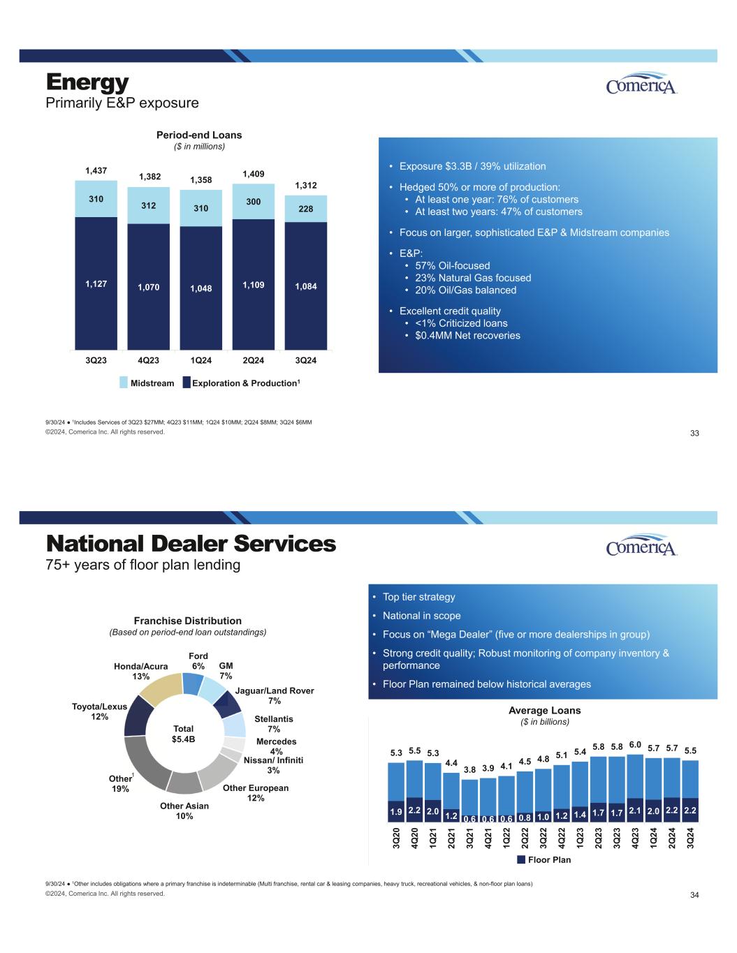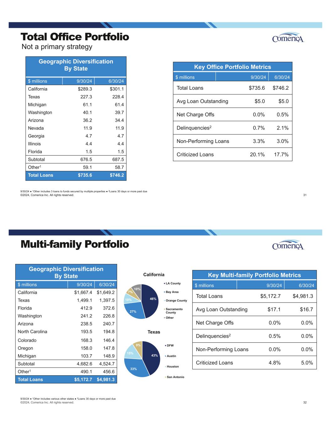 31©2024, Comerica Inc. All rights reserved. Total Office Portfolio Not a primary strategy Geographic Diversification By State $ millions 9/30/24 6/30/24 California $289.3 $301.1 Texas 227.3 228.4 Michigan 61.1 61.4 Washington 40.1 39.7 Arizona 36.2 34.4 Nevada 11.9 11.9 Georgia 4.7 4.7 Illinois 4.4 4.4 Florida 1.5 1.5 Subtotal 676.5 687.5 Other1 59.1 58.7 Total Loans $735.6 $746.2 Key Office Portfolio Metrics $ millions 9/30/24 6/30/24 Total Loans $735.6 $746.2 Avg Loan Outstanding $5.0 $5.0 Net Charge Offs 0.0% 0.5% Delinquencies2 0.7% 2.1% Non-Performing Loans 3.3% 3.0% Criticized Loans 20.1% 17.7% 9/30/24 1Other includes 3 loans to funds secured by multiple properties 2Loans 30 days or more past due 32©2024, Comerica Inc. All rights reserved. Multi-family Portfolio Key Multi-family Portfolio Metrics $ millions 9/30/24 6/30/24 Total Loans $5,172.7 $4,981.3 Avg Loan Outstanding $17.1 $16.7 Net Charge Offs 0.0% 0.0% Delinquencies2 0.5% 0.0% Non-Performing Loans 0.0% 0.0% Criticized Loans 4.8% 5.0% 9/30/24 1Other includes various other states 2Loans 30 days or more past due 46% 27% 10% 7% 10% California LA County Bay Area Orange County Sacramento County Other 43% 33% 15% 9% Texas DFW Austin Houston San Antonio Geographic Diversification By State $ millions 9/30/24 6/30/24 California $1,667.4 $1,649.2 Texas 1,499.1 1,397.5 Florida 412.9 372.6 Washington 241.2 226.8 Arizona 238.5 240.7 North Carolina 193.5 194.8 Colorado 168.3 146.4 Oregon 158.0 147.8 Michigan 103.7 148.9 Subtotal 4,682.6 4,524.7 Other1 490.1 456.6 Total Loans $5,172.7 $4,981.3