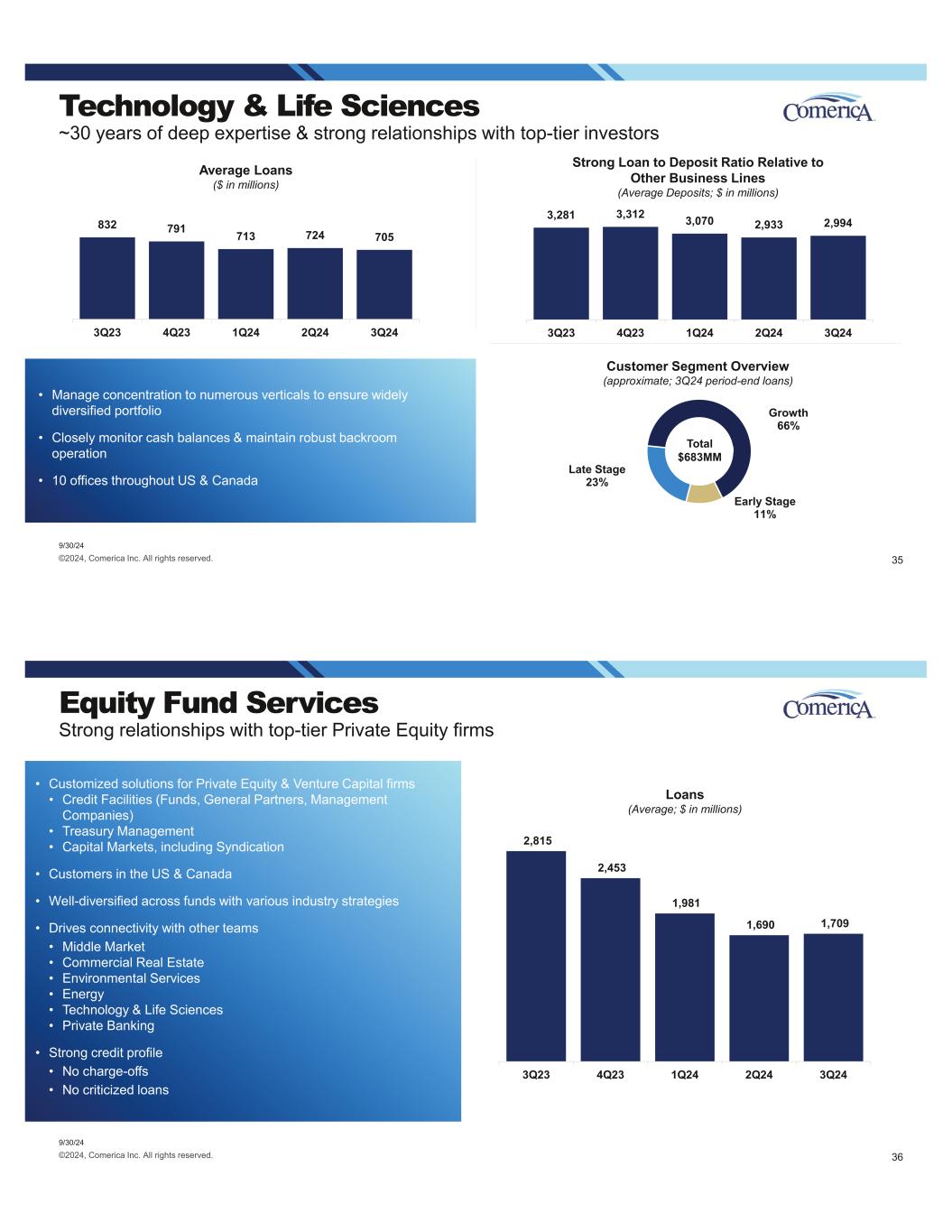 3,281 3,312 3,070 2,933 2,994 0 500 1,000 1,500 2,000 2,500 3,000 3,500 3Q23 4Q23 1Q24 2Q24 3Q24 832 791 713 724 705 3Q23 4Q23 1Q24 2Q24 3Q24 Technology & Life Sciences ~30 years of deep expertise & strong relationships with top-tier investors 9/30/24 Average Loans ($ in millions) • Manage concentration to numerous verticals to ensure widely diversified portfolio • Closely monitor cash balances & maintain robust backroom operation • 10 offices throughout US & Canada Strong Loan to Deposit Ratio Relative to Other Business Lines (Average Deposits; $ in millions) Growth 66% Early Stage 11% Late Stage 23% Customer Segment Overview (approximate; 3Q24 period-end loans) Total $683MM ©2024, Comerica Inc. All rights reserved. 35 2,815 2,453 1,981 1,690 1,709 3Q23 4Q23 1Q24 2Q24 3Q24 Equity Fund Services Strong relationships with top-tier Private Equity firms 9/30/24 • Customized solutions for Private Equity & Venture Capital firms • Credit Facilities (Funds, General Partners, Management Companies) • Treasury Management • Capital Markets, including Syndication • Customers in the US & Canada • Well-diversified across funds with various industry strategies • Drives connectivity with other teams • Middle Market • Commercial Real Estate • Environmental Services • Energy • Technology & Life Sciences • Private Banking • Strong credit profile • No charge-offs • No criticized loans ©2024, Comerica Inc. All rights reserved. 36 Loans (Average; $ in millions)