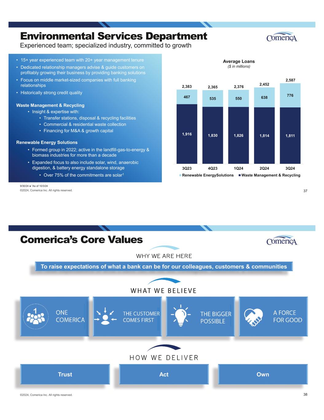 Environmental Services Department Experienced team; specialized industry, committed to growth 9/30/24 1As of 10/3/24 • 15+ year experienced team with 20+ year management tenure • Dedicated relationship managers advise & guide customers on profitably growing their business by providing banking solutions • Focus on middle market-sized companies with full banking relationships • Historically strong credit quality Waste Management & Recycling • Insight & expertise with: • Transfer stations, disposal & recycling facilities • Commercial & residential waste collection • Financing for M&A & growth capital Renewable Energy Solutions • Formed group in 2022; active in the landfill-gas-to-energy & biomass industries for more than a decade • Expanded focus to also include solar, wind, anaerobic digestion, & battery energy standalone storage • Over 75% of the commitments are solar1 1,916 1,830 1,826 1,814 1,811 467 535 550 638 776 2,383 2,365 2,376 2,452 2,587 3Q23 4Q23 1Q24 2Q24 3Q24 Renewable EnergySolutions Waste Management & Recycling Average Loans ($ in millions) ©2024, Comerica Inc. All rights reserved. 37 ©2024, Comerica Inc. All rights reserved. Comerica’s Core Values Trust OwnAct To raise expectations of what a bank can be for our colleagues, customers & communities 38