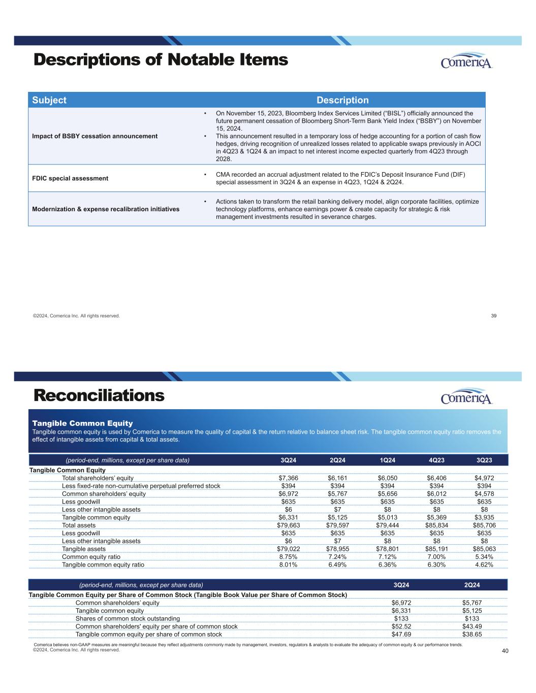 39©2024, Comerica Inc. All rights reserved. Descriptions of Notable Items Subject Description Impact of BSBY cessation announcement • On November 15, 2023, Bloomberg Index Services Limited (“BISL”) officially announced the future permanent cessation of Bloomberg Short-Term Bank Yield Index (“BSBY”) on November 15, 2024. • This announcement resulted in a temporary loss of hedge accounting for a portion of cash flow hedges, driving recognition of unrealized losses related to applicable swaps previously in AOCI in 4Q23 & 1Q24 & an impact to net interest income expected quarterly from 4Q23 through 2028. FDIC special assessment • CMA recorded an accrual adjustment related to the FDIC’s Deposit Insurance Fund (DIF) special assessment in 3Q24 & an expense in 4Q23, 1Q24 & 2Q24. Modernization & expense recalibration initiatives • Actions taken to transform the retail banking delivery model, align corporate facilities, optimize technology platforms, enhance earnings power & create capacity for strategic & risk management investments resulted in severance charges. Reconciliations ©2024, Comerica Inc. All rights reserved. 40 (period-end, millions, except per share data) 3Q24 2Q24 1Q24 4Q23 3Q23 Tangible Common Equity Total shareholders’ equity $7,366 $6,161 $6,050 $6,406 $4,972 Less fixed-rate non-cumulative perpetual preferred stock $394 $394 $394 $394 $394 Common shareholders’ equity $6,972 $5,767 $5,656 $6,012 $4,578 Less goodwill $635 $635 $635 $635 $635 Less other intangible assets $6 $7 $8 $8 $8 Tangible common equity $6,331 $5,125 $5,013 $5,369 $3,935 Total assets $79,663 $79,597 $79,444 $85,834 $85,706 Less goodwill $635 $635 $635 $635 $635 Less other intangible assets $6 $7 $8 $8 $8 Tangible assets $79,022 $78,955 $78,801 $85,191 $85,063 Common equity ratio 8.75% 7.24% 7.12% 7.00% 5.34% Tangible common equity ratio 8.01% 6.49% 6.36% 6.30% 4.62% Tangible Common Equity Tangible common equity is used by Comerica to measure the quality of capital & the return relative to balance sheet risk. The tangible common equity ratio removes the effect of intangible assets from capital & total assets. Comerica believes non-GAAP measures are meaningful because they reflect adjustments commonly made by management, investors, regulators & analysts to evaluate the adequacy of common equity & our performance trends. (period-end, millions, except per share data) 3Q24 2Q24 Tangible Common Equity per Share of Common Stock (Tangible Book Value per Share of Common Stock) Common shareholders’ equity $6,972 $5,767 Tangible common equity $6,331 $5,125 Shares of common stock outstanding $133 $133 Common shareholders' equity per share of common stock $52.52 $43.49 Tangible common equity per share of common stock $47.69 $38.65