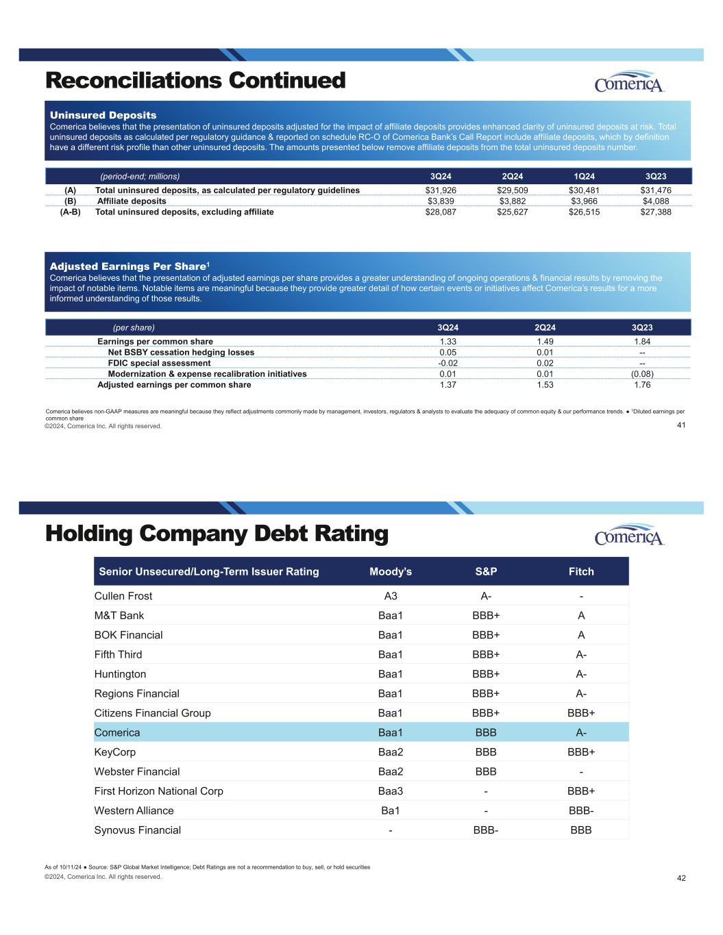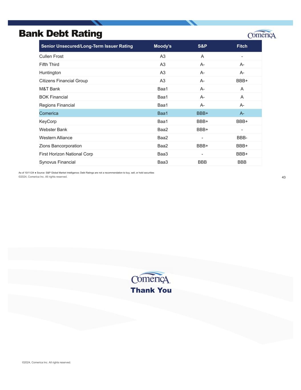 ©2024, Comerica Inc. All rights reserved. Uninsured Deposits Comerica believes that the presentation of uninsured deposits adjusted for the impact of affiliate deposits provides enhanced clarity of uninsured deposits at risk. Total uninsured deposits as calculated per regulatory guidance & reported on schedule RC-O of Comerica Bank’s Call Report include affiliate deposits, which by definition have a different risk profile than other uninsured deposits. The amounts presented below remove affiliate deposits from the total uninsured deposits number. Reconciliations Continued Comerica believes non-GAAP measures are meaningful because they reflect adjustments commonly made by management, investors, regulators & analysts to evaluate the adequacy of common equity & our performance trends. 1Diluted earnings per common share (period-end; millions) 3Q24 2Q24 1Q24 3Q23 (A) Total uninsured deposits, as calculated per regulatory guidelines $31,926 $29,509 $30,481 $31,476 (B) Affiliate deposits $3,839 $3,882 $3,966 $4,088 (A-B) Total uninsured deposits, excluding affiliate $28,087 $25,627 $26,515 $27,388 41 Adjusted Earnings Per Share1 Comerica believes that the presentation of adjusted earnings per share provides a greater understanding of ongoing operations & financial results by removing the impact of notable items. Notable items are meaningful because they provide greater detail of how certain events or initiatives affect Comerica’s results for a more informed understanding of those results. (per share) 3Q24 2Q24 3Q23 Earnings per common share 1.33 1.49 1.84 Net BSBY cessation hedging losses 0.05 0.01 -- FDIC special assessment -0.02 0.02 -- Modernization & expense recalibration initiatives 0.01 0.01 (0.08) Adjusted earnings per common share 1.37 1.53 1.76 Holding Company Debt Rating As of 10/11/24 Source: S&P Global Market Intelligence; Debt Ratings are not a recommendation to buy, sell, or hold securities Senior Unsecured/Long-Term Issuer Rating Moody’s S&P Fitch Cullen Frost A3 A- - M&T Bank Baa1 BBB+ A BOK Financial Baa1 BBB+ A Fifth Third Baa1 BBB+ A- Huntington Baa1 BBB+ A- Regions Financial Baa1 BBB+ A- Citizens Financial Group Baa1 BBB+ BBB+ Comerica Baa1 BBB A- KeyCorp Baa2 BBB BBB+ Webster Financial Baa2 BBB - First Horizon National Corp Baa3 - BBB+ Western Alliance Ba1 - BBB- Synovus Financial - BBB- BBB ©2024, Comerica Inc. All rights reserved. 42