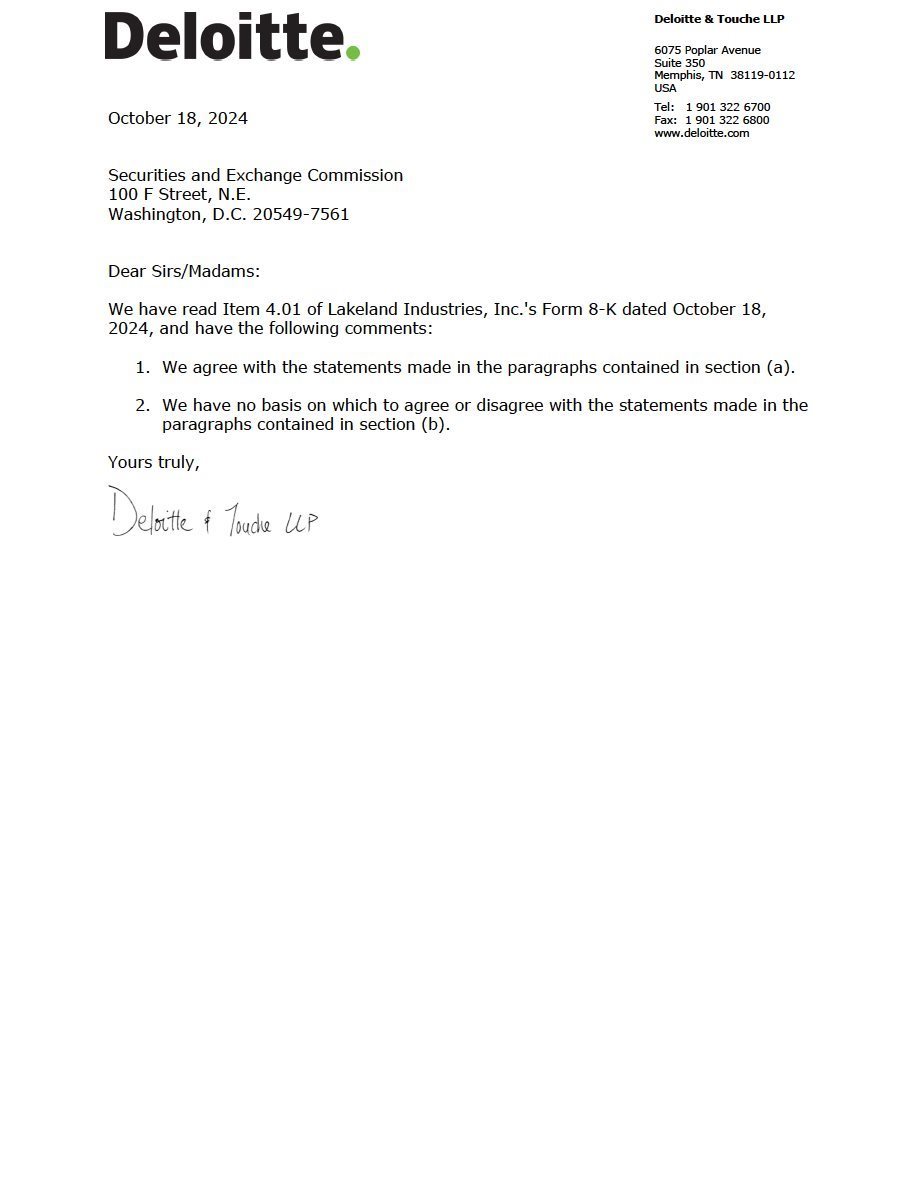 (a) On October 11, 2024, Lakeland Industries, Inc. (the “Company”) dismissed its independent accountant, Deloitte & Touche LLP (“Deloitte”), effective immediately. The dismissal of Deloitte was approved by the Audit Committee of the Company’s Board of Directors (the “Audit Committee”).