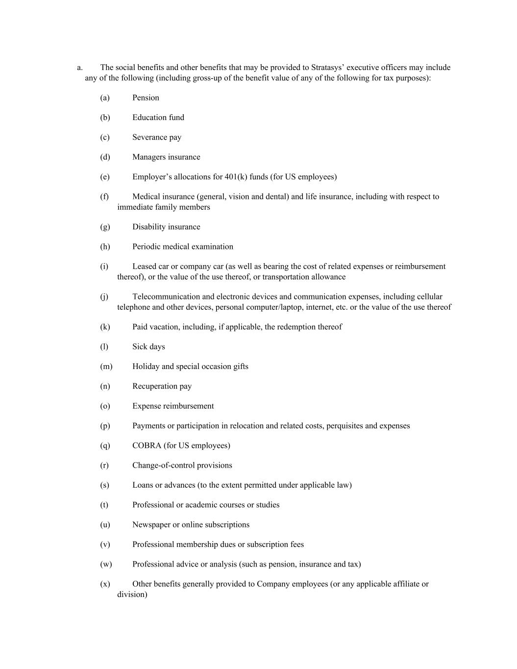 The subject limitation on non-statutory severance benefits had been incorporated into the existing Compensation Policy in response to comments received from certain shareholders prior to the 2021 Annual Meeting. In response to those shareholders, Stratasys had agreed to limit the aggregate payments that may potentially be payable to a single terminating/terminated executive officer as “Severance Payments”, “Non-compete payments”, “Change of control payments” or “Discretionary payments” to the product of twenty-four (24) and the executive officer's last monthly base salary.