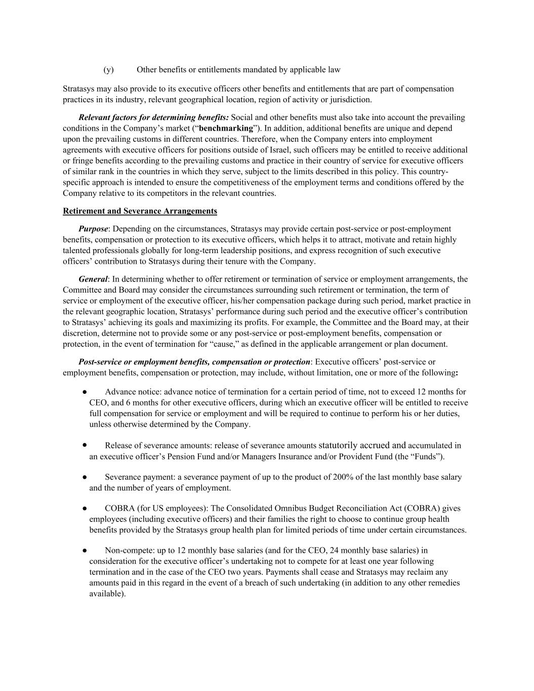 Specifically, the version of the Compensation Policy attached to the Proxy Statement inadvertently omitted a limitation on potential non-statutory severance benefits for a terminated executive officer—limiting the amount of those benefits to an aggregate of the product of twenty-four (24) and the executive officer's last monthly base salary. That limitation was part of the existing Compensation Policy adopted by Stratasys’ shareholders at Stratasys’ 2021 annual general meeting of shareholders, which was held on November 23, 2021 (the “2021 Annual Meeting”) and which appears at the following link: