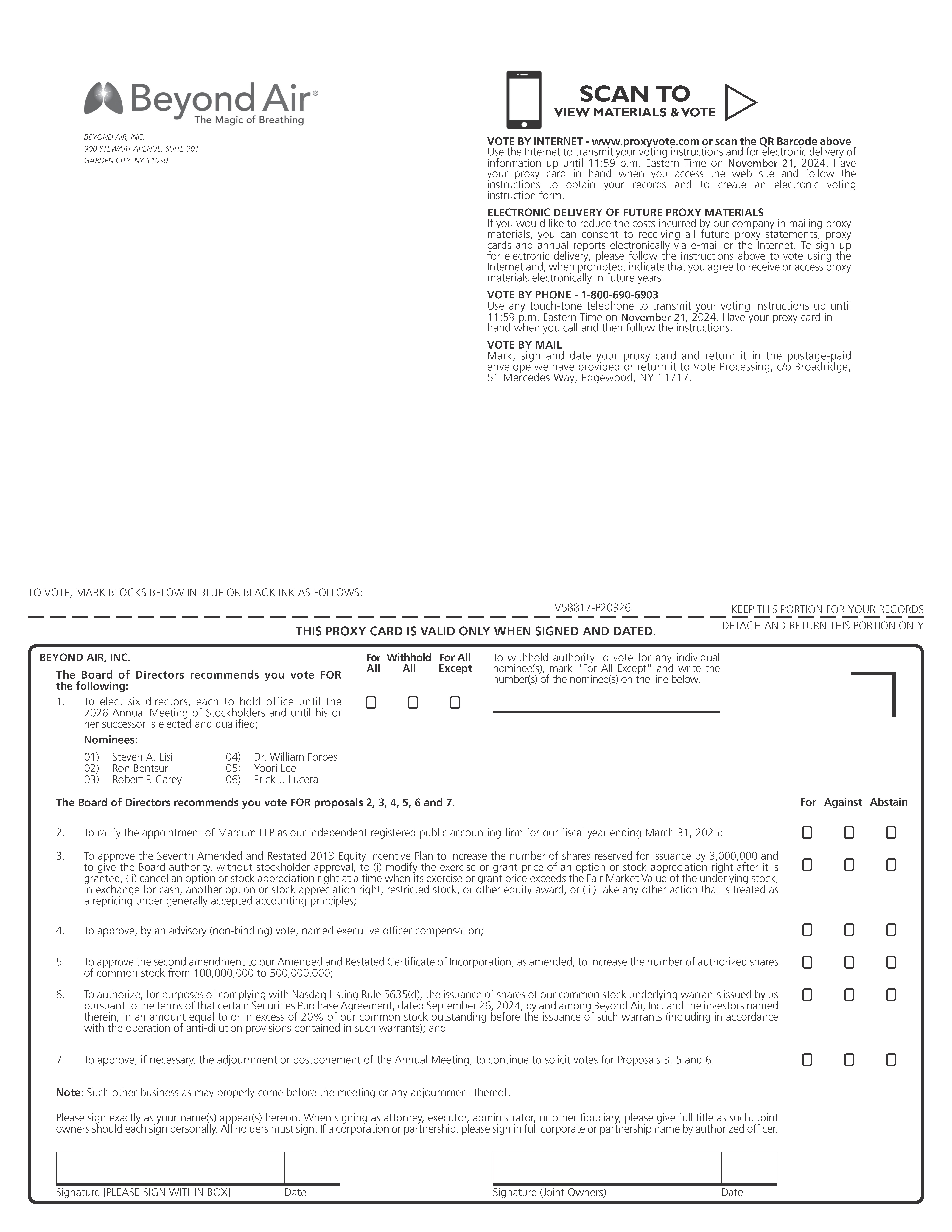 | 6. | To authorize, for purposes of complying with Nasdaq Listing Rule 5635(d), the issuance of shares of our common stock underlying warrants issued by us pursuant to the terms of that certain Securities Purchase Agreement, dated September 26, 2024, by and among Beyond Air, Inc. and the investors named therein, in an amount equal to or in excess of 20% of our common stock outstanding before the issuance of such warrants (including in accordance with the operation of anti-dilution provisions contained in such warrants); | |