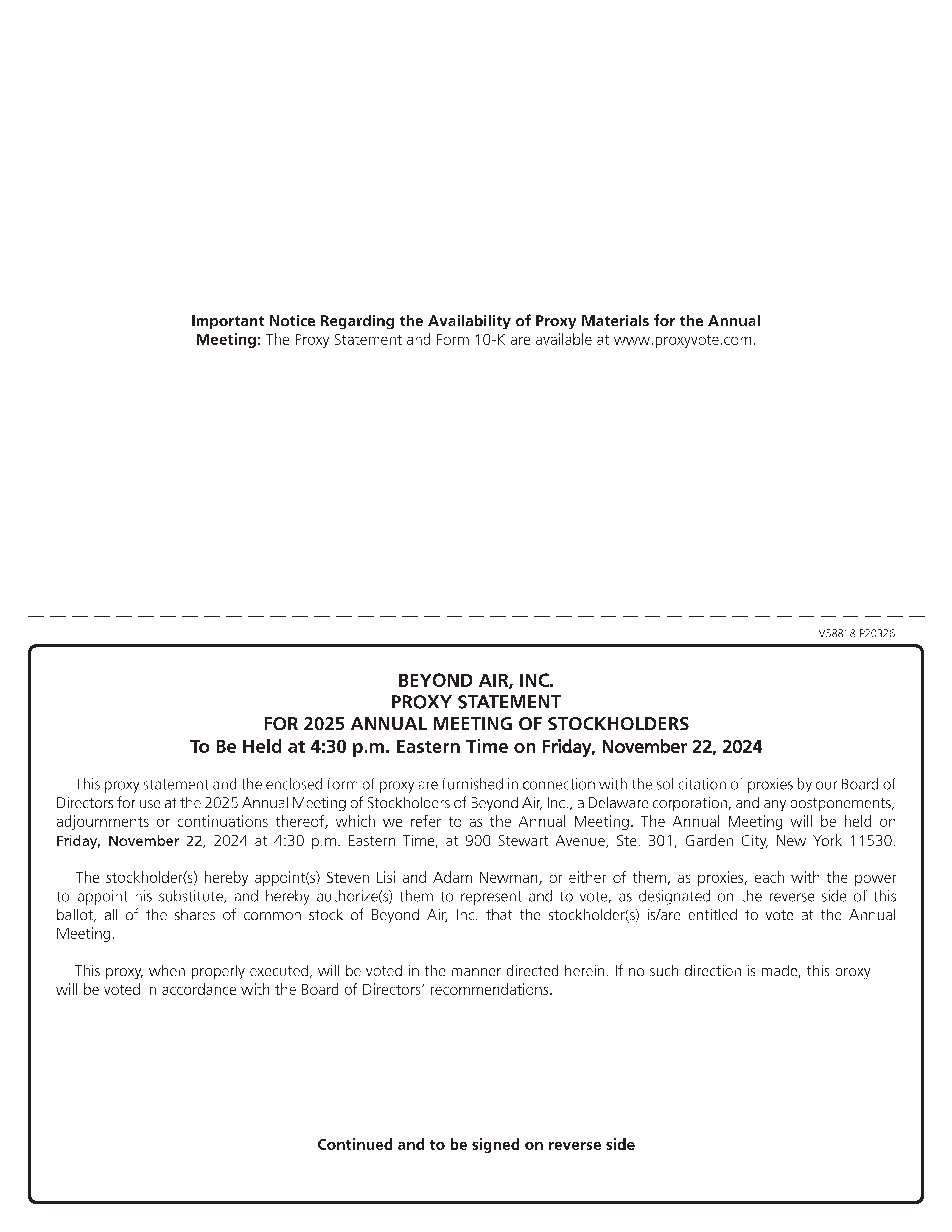 We cordially invite you to attend the 2025 annual meeting of stockholders, which we refer to as the Annual Meeting, of Beyond Air, Inc., a Delaware corporation, which will be held on Friday, November 22, 2024 at 4:30 p.m. Eastern Time, in person at the offices of Beyond Air, Inc., 900 Stewart Avenue, Suite 301, Garden City, New York, 11530, for the following purposes, as more fully described in the accompanying proxy statement: