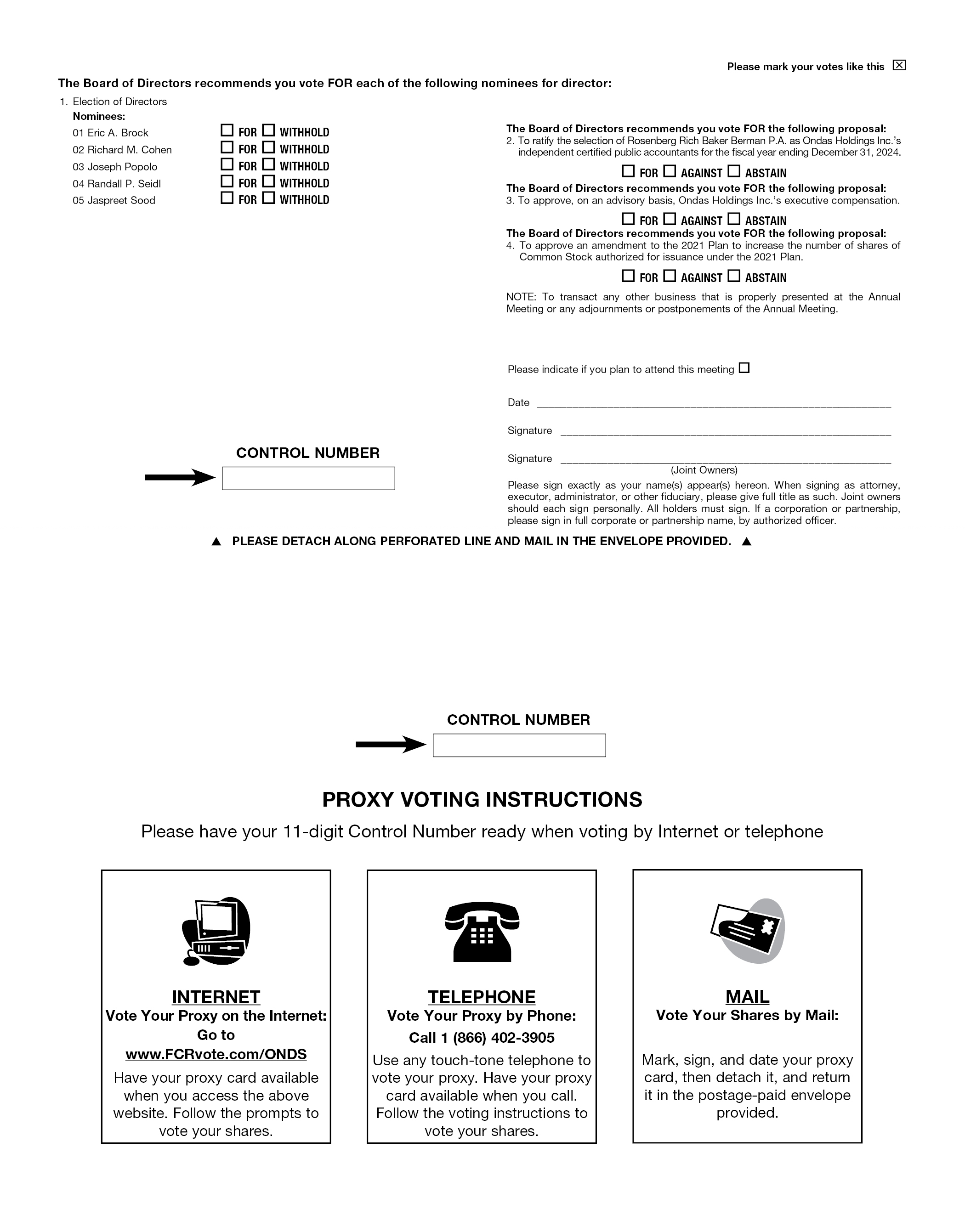 Please mark your votes like this x PLEASE DETACH ALONG PERFORATED LINE AND MAIL IN THE ENVELOPE PROVIDED. Please indicate if you plan to attend this meeting o The Board of Directors recommends you vote FOR each of the following nominees for director: 1. Election of Directors Nominees: 01 Eric A. Brock FOR WITHHOLD 02 Richard M. Cohen FOR WITHHOLD 03 Joseph Popolo FOR WITHHOLD 04 Randall P. Seidl FOR WITHHOLD 05 Jaspreet Sood FOR WITHHOLD CONTROL NUMBER Date Signature Signature (Joint Owners) Please sign exactly as your name(s) appear(s) hereon. When signing as attorney, executor, administrator, or other fiduciary, please give full title as such. Joint owners should each sign personally. All holders must sign. If a corporation or partnership, please sign in full corporate or partnership name, by authorized officer. The Board of Directors recommends you vote FOR the following proposal: 2. To ratify the selection of Rosenberg Rich Baker Berman P.A. as Ondas Holdings Inc.’s independent certified public accountants for the fiscal year ending December 31, 2024. FOR AGAINST ABSTAIN The Board of Directors recommends you vote FOR the following proposal: 3. To approve, on an advisory basis, Ondas Holdings Inc.’s executive compensation. FOR AGAINST ABSTAIN The Board of Directors recommends you vote FOR the following proposal: 4. To approve an amendment to the 2021 Plan to increase the number of shares of Common Stock authorized for issuance under the 2021 Plan. FOR AGAINST ABSTAIN NOTE: To transact any other business that is properly presented at the Annual Meeting or any adjournments or postponements of the Annual Meeting. CONTROL NUMBER PROXY VOTING INSTRUCTIONS Please have your 11-digit Control Number ready when voting by Internet or telephone INTERNET Vote Your Proxy on the Internet: Go to www.FCRvote.com/ONDS Have your proxy card available when you access the above website. Follow the prompts to vote your shares. TELEPHONE Vote Your Proxy by Phone: Call 1 (866) 402-3905 Use any touch-tone telephone to vote your proxy. Have your proxy card available when you call. Follow the voting instructions to vote your shares. MAIL Vote Your Shares by Mail: Mark, sign, and date your proxy card, then detach it, and return it in the postage-paid envelope provided.