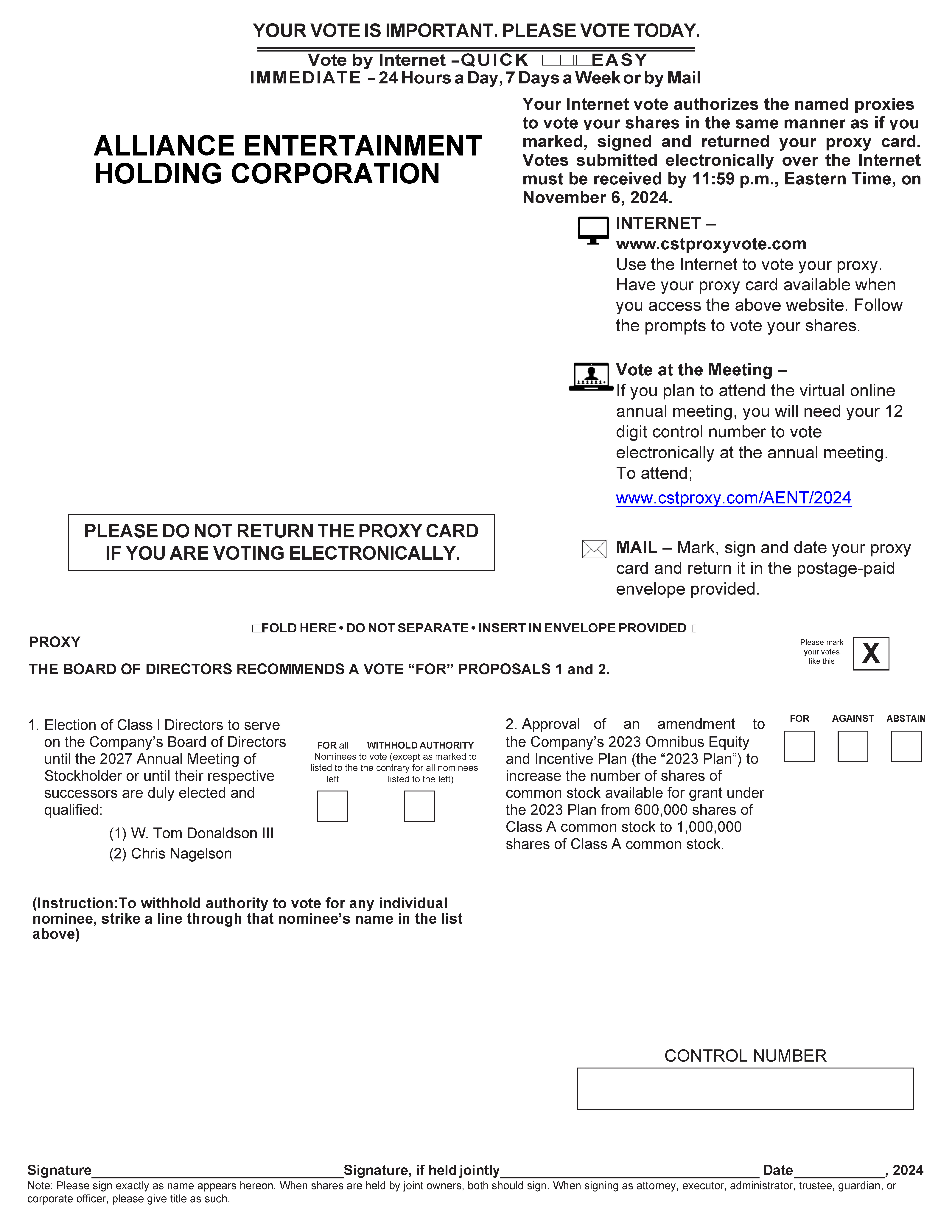 We are very pleased to invite you to the virtual 2024 Annual Meeting of Stockholders of Alliance Entertainment Holding Corporation, which will be held on Thursday, November 7, 2024, at 1:15 p.m., Eastern Time. The Annual Meeting will be held virtually via live internet webcast at www.cstproxy.com/aent/2024.