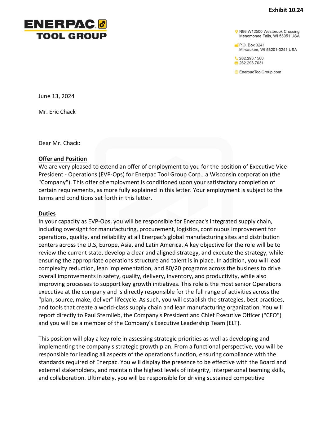 Pursuant to 18 U.S.C. ss.1350, I, the undersigned President and Chief Executive Officer of Enerpac Tool Group Corp. (the “Company”), hereby certify, based on my knowledge, that the Annual Report on Form 10-K of the Company for the annual period ended August 31, 2024 (the “Report”) fully complies with the requirements of Sections 13(a) or 15(d) of the Securities Exchange Act of 1934 and that information contained in the Report fairly presents, in all material respects, the financial condition and results of operations of the Company as of and for the periods covered in the Report.