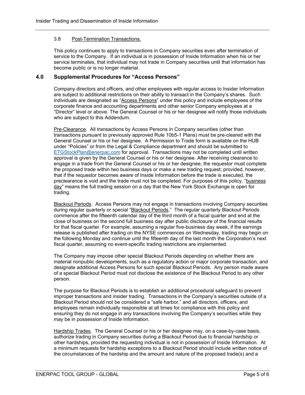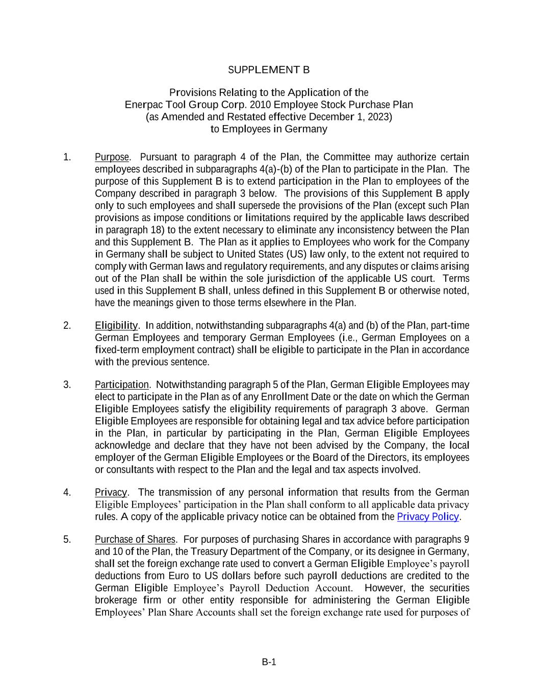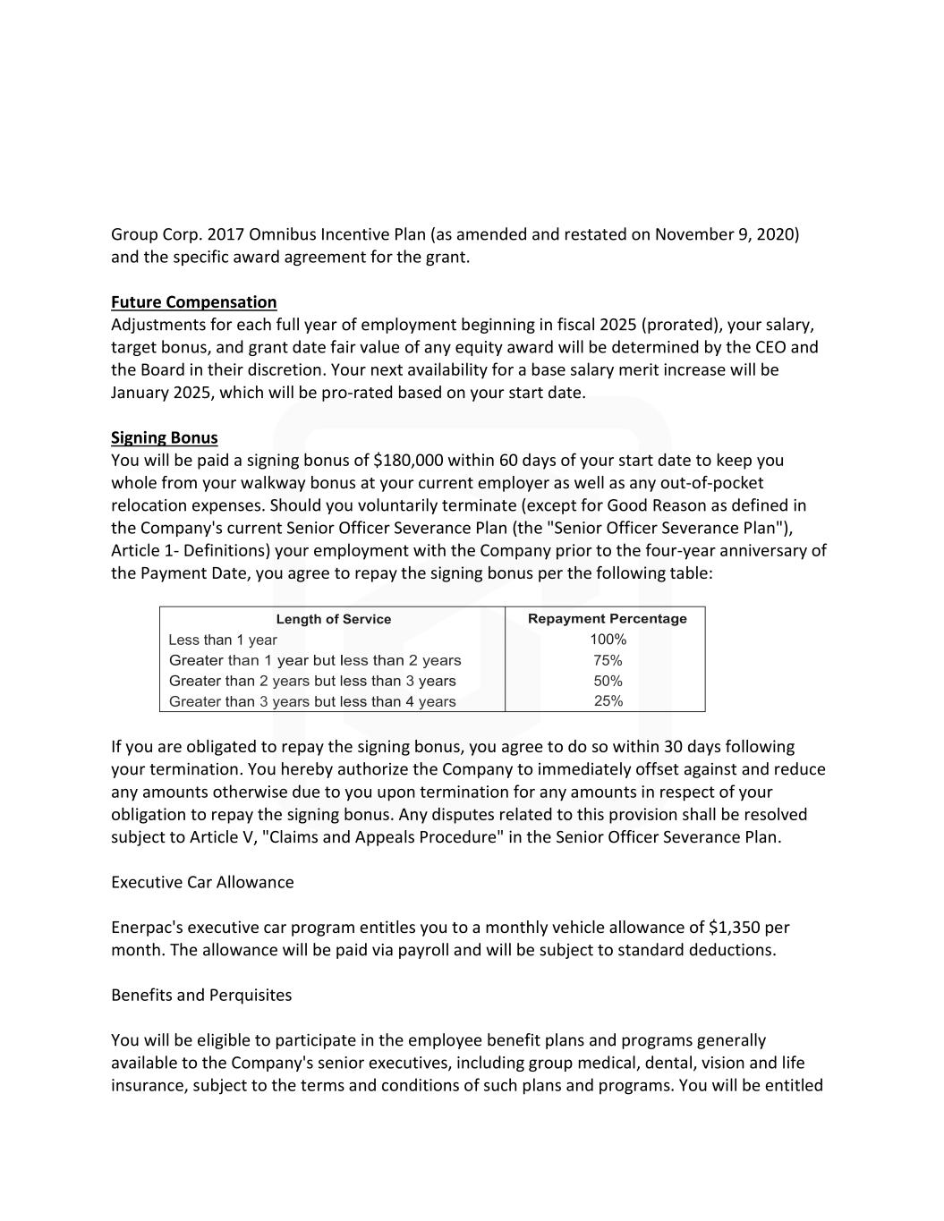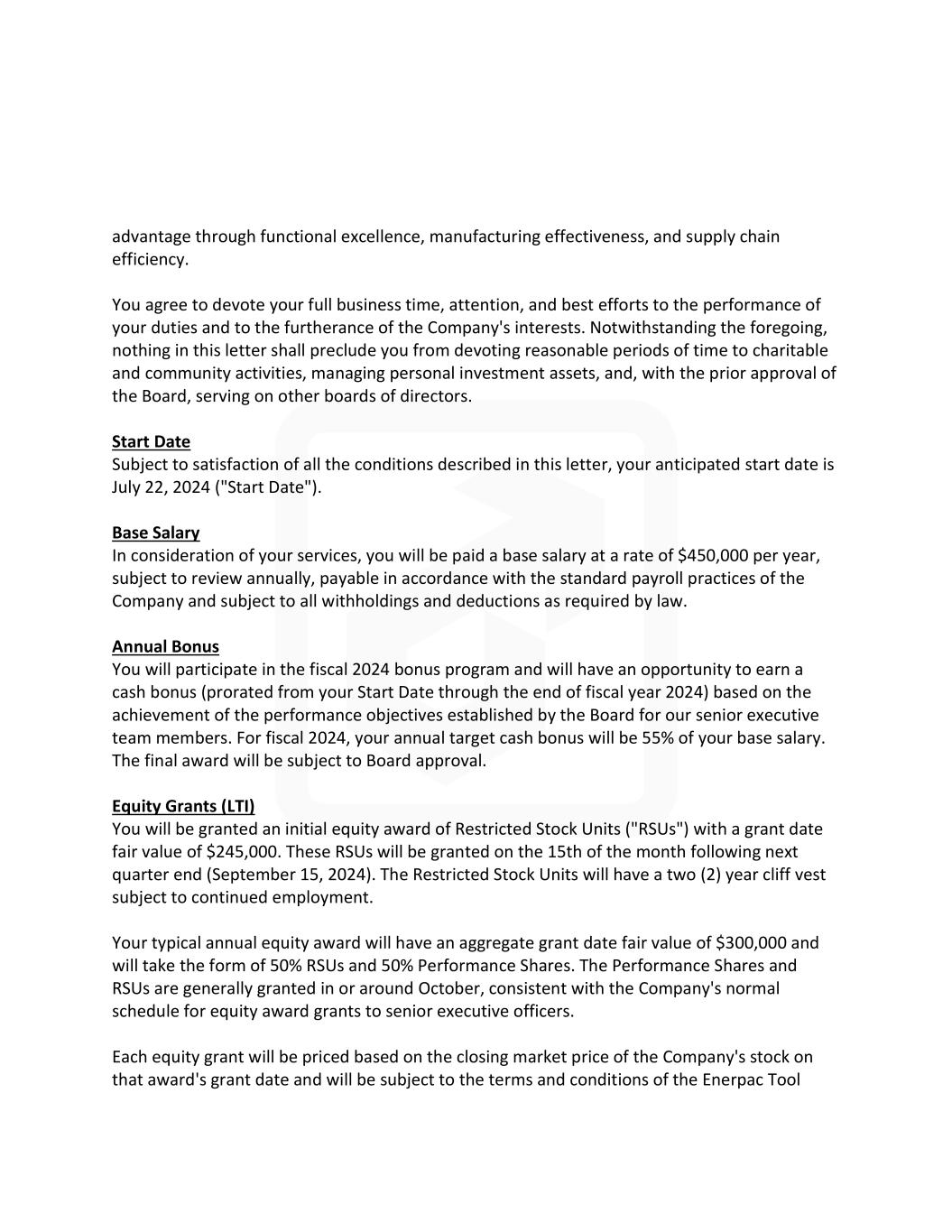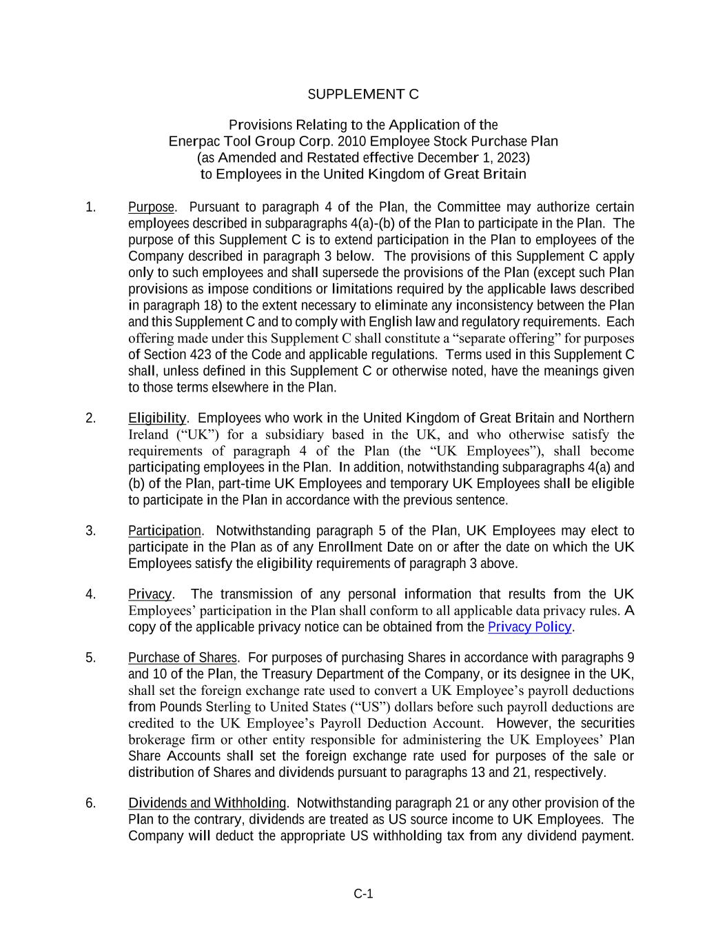 When used herein, the terms “we,” “us,” “our,” “Enerpac,” and the “Company” refer to Enerpac Tool Group Corp. and its subsidiaries. Reference to fiscal years, such as “fiscal 2024,” are to the fiscal year ending on August 31 of the specified year.