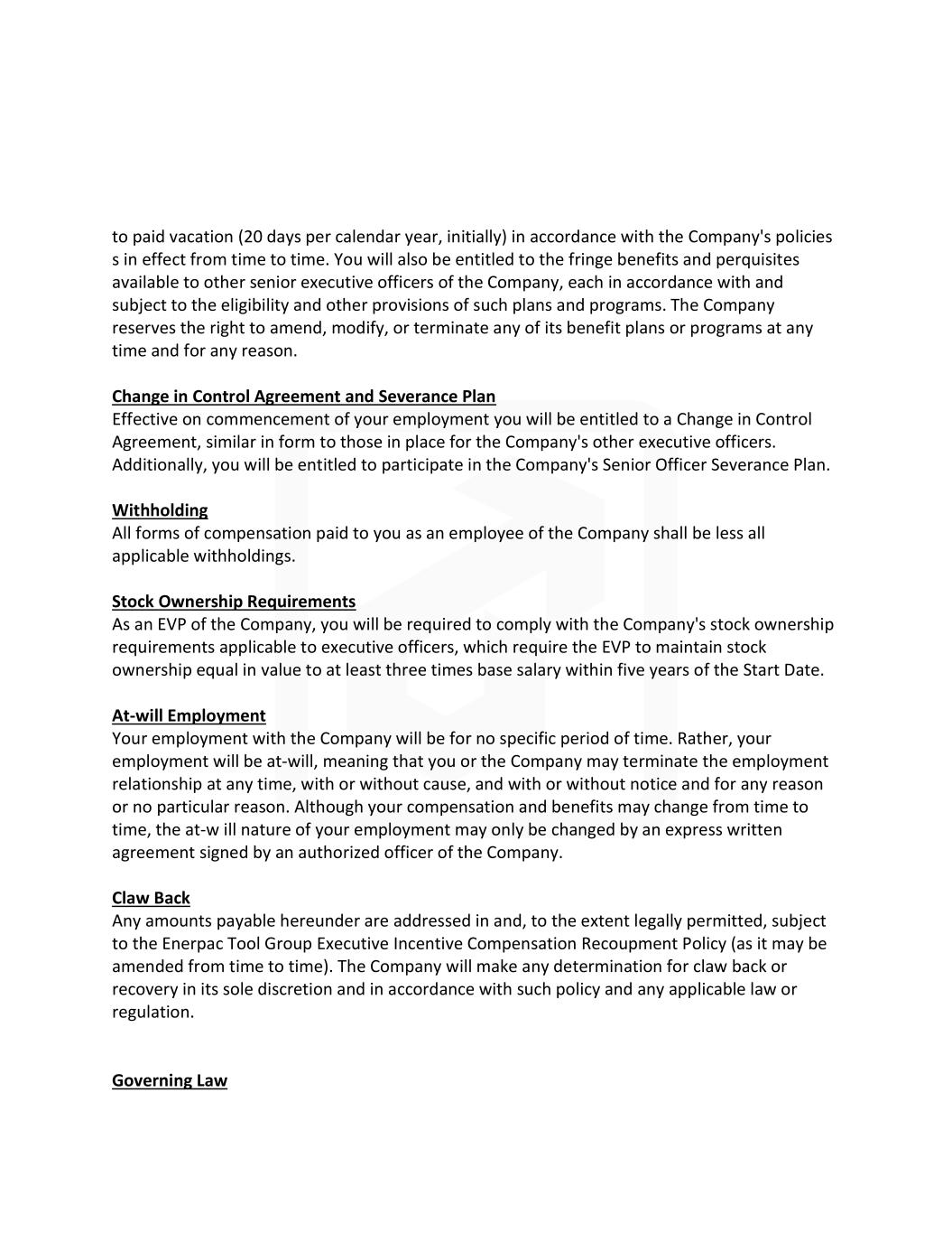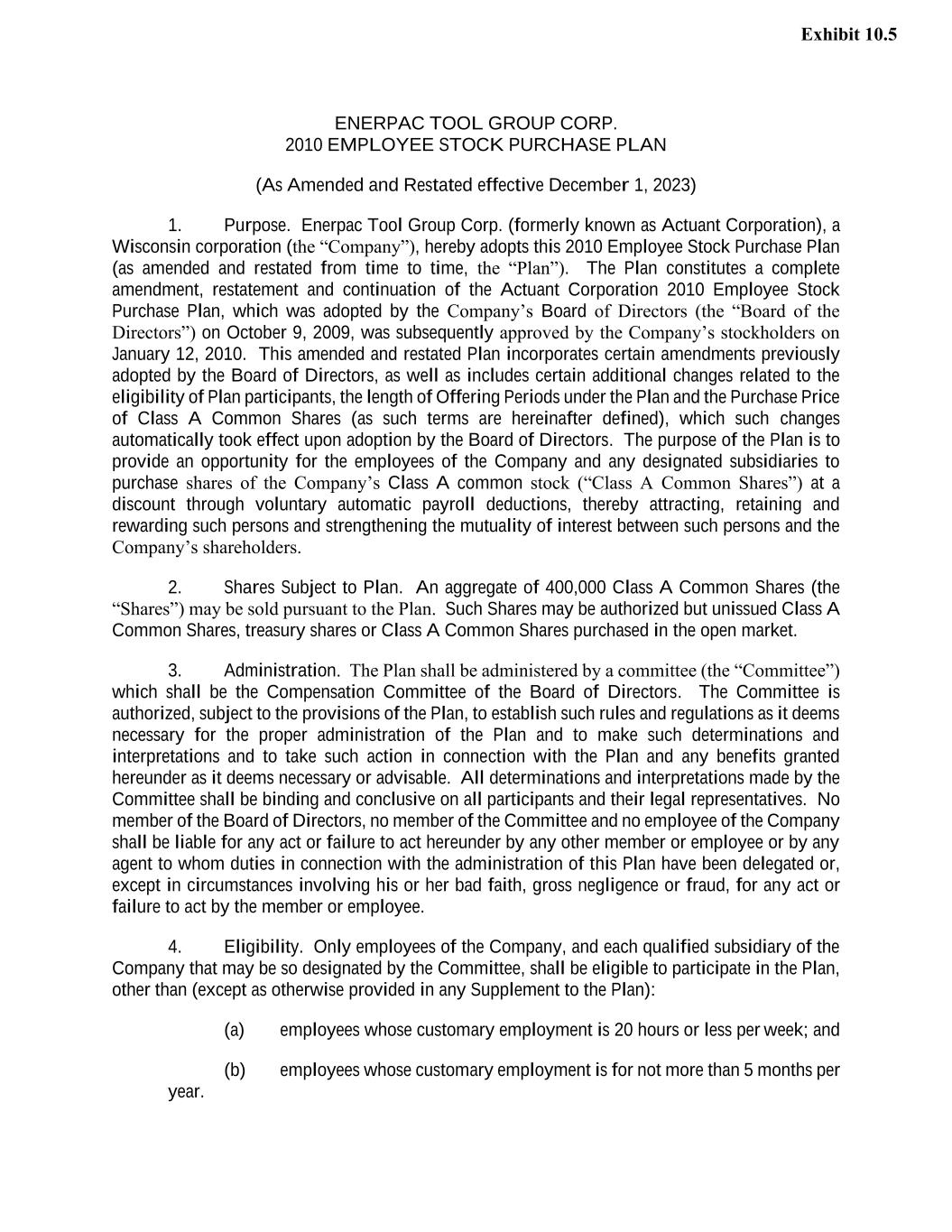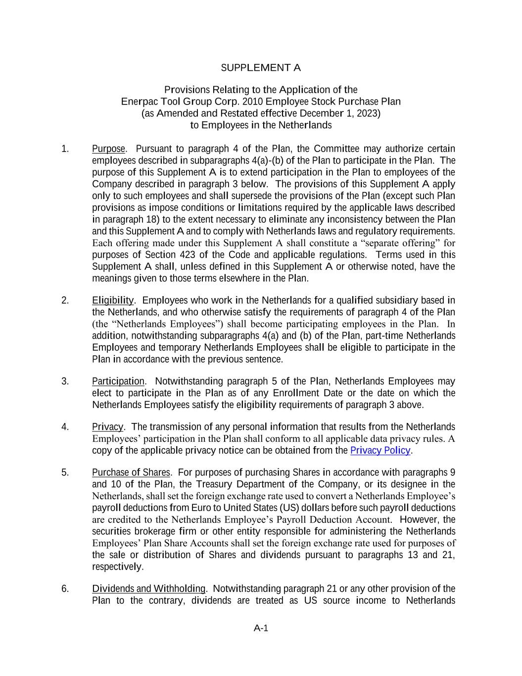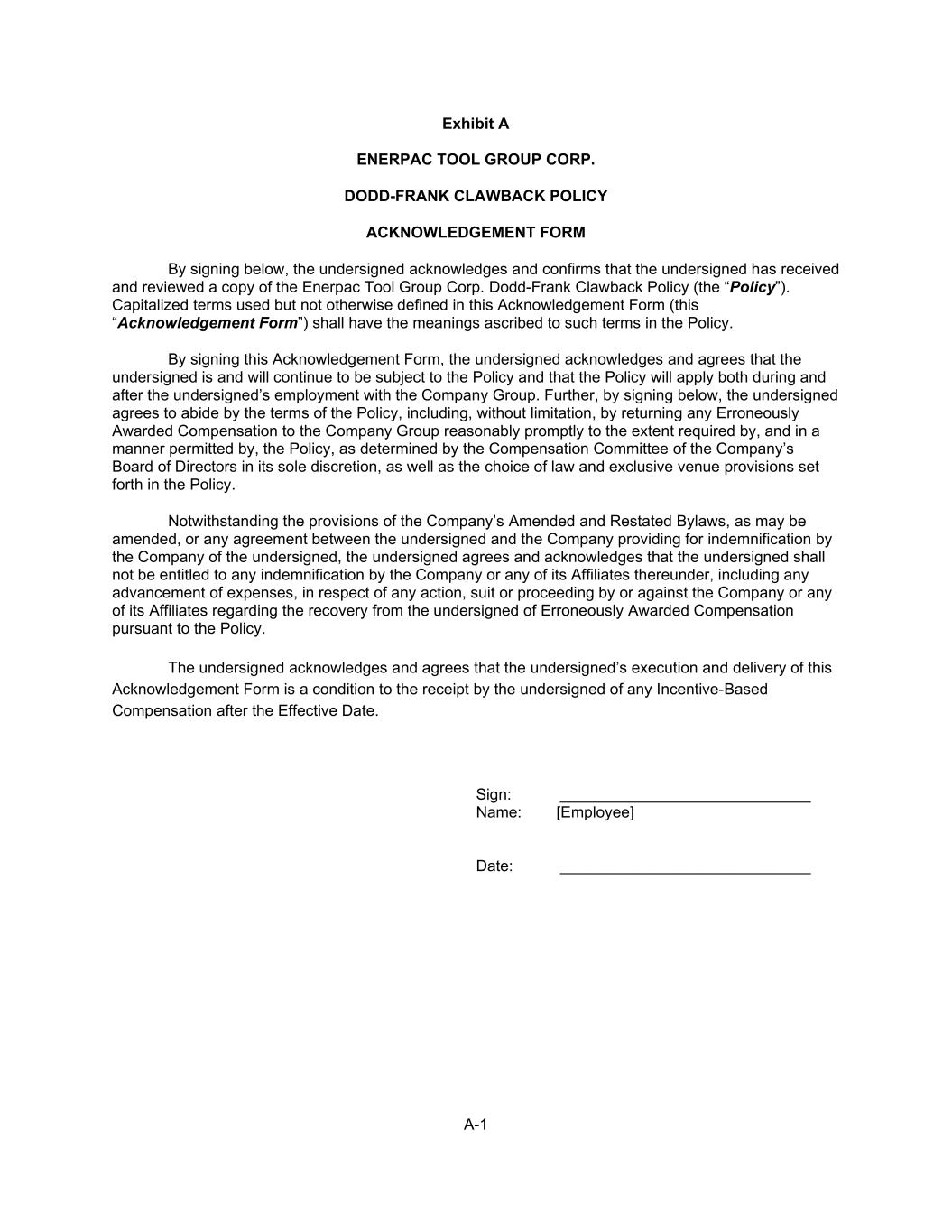 A-1 Exhibit A ENERPAC TOOL GROUP CORP. DODD-FRANK CLAWBACK POLICY ACKNOWLEDGEMENT FORM By signing below, the undersigned acknowledges and confirms that the undersigned has received and reviewed a copy of the Enerpac Tool Group Corp. Dodd-Frank Clawback Policy (the “Policy”). Capitalized terms used but not otherwise defined in this Acknowledgement Form (this “Acknowledgement Form”) shall have the meanings ascribed to such terms in the Policy. By signing this Acknowledgement Form, the undersigned acknowledges and agrees that the undersigned is and will continue to be subject to the Policy and that the Policy will apply both during and after the undersigned’s employment with the Company Group. Further, by signing below, the undersigned agrees to abide by the terms of the Policy, including, without limitation, by returning any Erroneously Awarded Compensation to the Company Group reasonably promptly to the extent required by, and in a manner permitted by, the Policy, as determined by the Compensation Committee of the Company’s Board of Directors in its sole discretion, as well as the choice of law and exclusive venue provisions set forth in the Policy. Notwithstanding the provisions of the Company’s Amended and Restated Bylaws, as may be amended, or any agreement between the undersigned and the Company providing for indemnification by the Company of the undersigned, the undersigned agrees and acknowledges that the undersigned shall not be entitled to any indemnification by the Company or any of its Affiliates thereunder, including any advancement of expenses, in respect of any action, suit or proceeding by or against the Company or any of its Affiliates regarding the recovery from the undersigned of Erroneously Awarded Compensation pursuant to the Policy. The undersigned acknowledges and agrees that the undersigned’s execution and delivery of this Acknowledgement Form is a condition to the receipt by the undersigned of any Incentive-Based Compensation after the Effective Date. Sign: _____________________________ Name: [Employee] Date: _____________________________