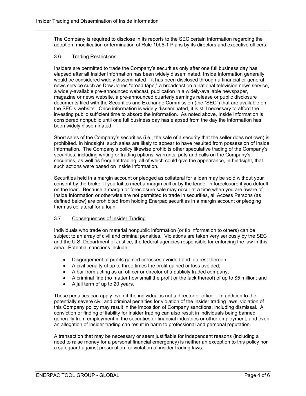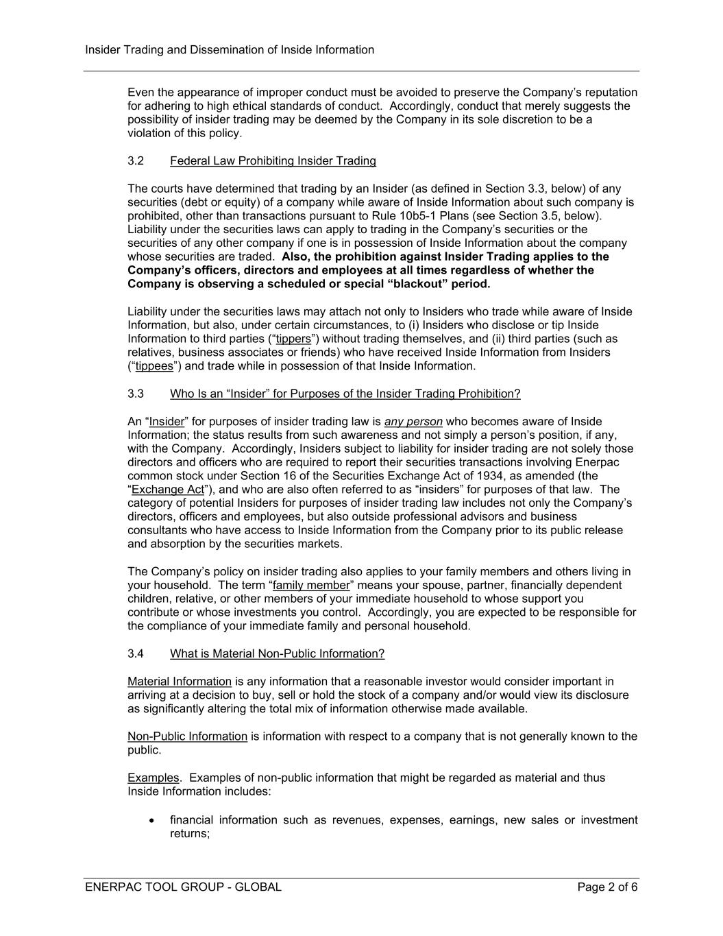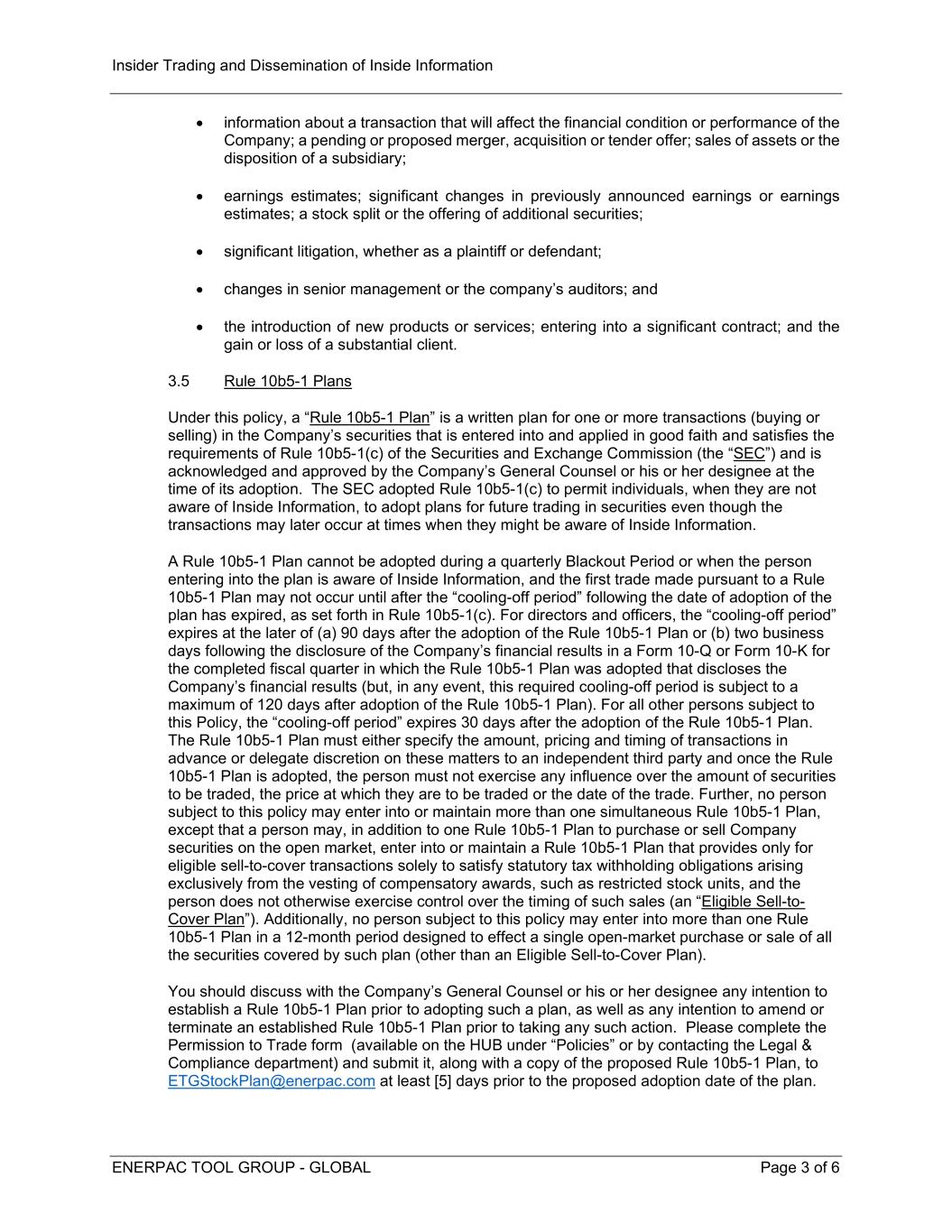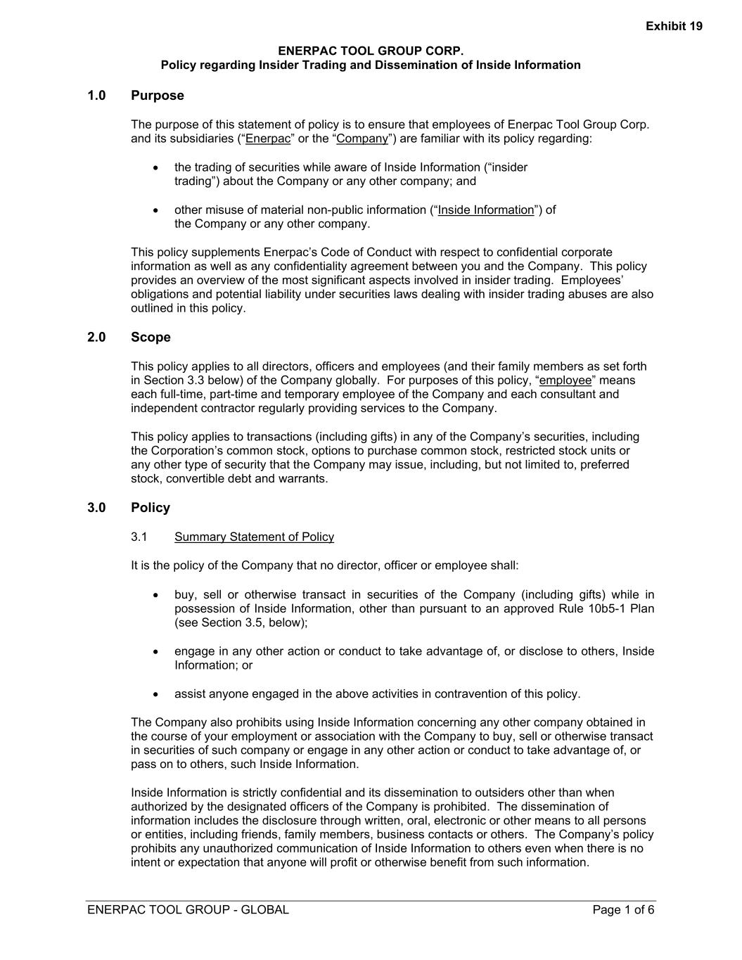 A-1 Exhibit A ENERPAC TOOL GROUP CORP. DODD-FRANK CLAWBACK POLICY ACKNOWLEDGEMENT FORM By signing below, the undersigned acknowledges and confirms that the undersigned has received and reviewed a copy of the Enerpac Tool Group Corp. Dodd-Frank Clawback Policy (the “Policy”). Capitalized terms used but not otherwise defined in this Acknowledgement Form (this “Acknowledgement Form”) shall have the meanings ascribed to such terms in the Policy. By signing this Acknowledgement Form, the undersigned acknowledges and agrees that the undersigned is and will continue to be subject to the Policy and that the Policy will apply both during and after the undersigned’s employment with the Company Group. Further, by signing below, the undersigned agrees to abide by the terms of the Policy, including, without limitation, by returning any Erroneously Awarded Compensation to the Company Group reasonably promptly to the extent required by, and in a manner permitted by, the Policy, as determined by the Compensation Committee of the Company’s Board of Directors in its sole discretion, as well as the choice of law and exclusive venue provisions set forth in the Policy. Notwithstanding the provisions of the Company’s Amended and Restated Bylaws, as may be amended, or any agreement between the undersigned and the Company providing for indemnification by the Company of the undersigned, the undersigned agrees and acknowledges that the undersigned shall not be entitled to any indemnification by the Company or any of its Affiliates thereunder, including any advancement of expenses, in respect of any action, suit or proceeding by or against the Company or any of its Affiliates regarding the recovery from the undersigned of Erroneously Awarded Compensation pursuant to the Policy. The undersigned acknowledges and agrees that the undersigned’s execution and delivery of this Acknowledgement Form is a condition to the receipt by the undersigned of any Incentive-Based Compensation after the Effective Date. Sign: _____________________________ Name: [Employee] Date: _____________________________