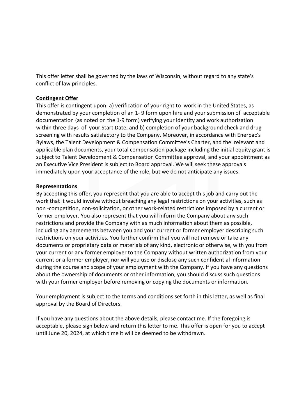 4 made a reasonable attempt to recoup the applicable Erroneously Awarded Compensation, documented such attempts, and provided such documentation to the NYSE; (ii) Recoupment would violate home country law where that law was adopted prior to November 28, 2022, provided that, before determining that it would be impracticable to recoup any amount of Erroneously Awarded Compensation based on violation of home country law, the Company has obtained an opinion of home country counsel, acceptable to the NYSE, that recoupment would result in such a violation and a copy of the opinion is provided to the NYSE; or (iii) Recoupment would likely cause an otherwise tax-qualified retirement plan, under which benefits are broadly available to employees, to fail to meet the requirements of 26 U.S.C. 401(a)(13) or 26 U.S.C. 411(a) and regulations thereunder. 4. Reporting and Disclosure. The Company shall file all disclosures with respect to this Policy in accordance with the requirements of the Dodd-Frank Rules. 5. Indemnification Prohibition. No member of the Company Group shall be permitted to indemnify any current or former Covered Executive against (i) the loss of any Erroneously Awarded Compensation that is recouped pursuant to the terms of this Policy, or (ii) any claims relating to the Company Group’s enforcement of its rights under this Policy. The Company may not pay or reimburse any Covered Executive for the cost of third-party insurance purchased by a Covered Executive to fund potential recoupment obligations under this Policy. 6. Acknowledgment. To the extent required by the Compensation Committee, each Covered Executive shall be required to sign and return to the Company the acknowledgement form attached hereto as Exhibit A pursuant to which such Covered Executive will agree to be bound by the terms of, and comply with, this Policy. For the avoidance of doubt, each Covered Executive will be fully bound by, and must comply with, the Policy, whether or not such Covered Executive has executed and returned such acknowledgment form to the Company. 7. Amendment; Termination. The Compensation Committee may amend or terminate this Policy from time to time in its discretion, including to comply with (or maintain an exemption from the application of) Section 409A of the Code or as and when it determines that it is legally required to do so by any federal securities laws, SEC rule or the rules of any national securities exchange or national securities association on which the Company’s securities are listed. 8. Other Recoupment Rights. The Compensation Committee intends that this Policy be applied to the fullest extent of the law. The Compensation Committee may require that any employment agreement, equity award, cash incentive award, or any other agreement entered into on or after the Effective Date be conditioned upon the Covered Executive’s agreement to abide by the terms of this Policy. Any right of recoupment under this Policy is in addition to, and not in lieu of, any other remedies or rights of recoupment that may be available to the Company Group, whether arising under applicable law, regulation or rule, pursuant to the terms of any other policy of the Company Group, pursuant to any employment agreement, equity award, cash incentive award, or other agreement applicable to a Covered Executive, or otherwise (the “Separate Clawback Rights”). Notwithstanding the foregoing, there shall be no duplication of recovery of the same Erroneously Awarded Compensation under this Policy and the Separate Clawback Rights, unless required by applicable law. 9. Successors. This Policy shall be binding and enforceable against all Covered Executives and their beneficiaries, heirs, executors, administrators or other legal representatives. 10. Governing Law; Venue. This Policy and all rights and obligations hereunder are governed by and construed in accordance with the internal laws of the State of Wisconsin, excluding any choice of law rules or principles that may direct the application of the laws of another jurisdiction. All actions arising out of or relating to this Policy shall be heard and determined exclusively in the Circuit Court of the State of