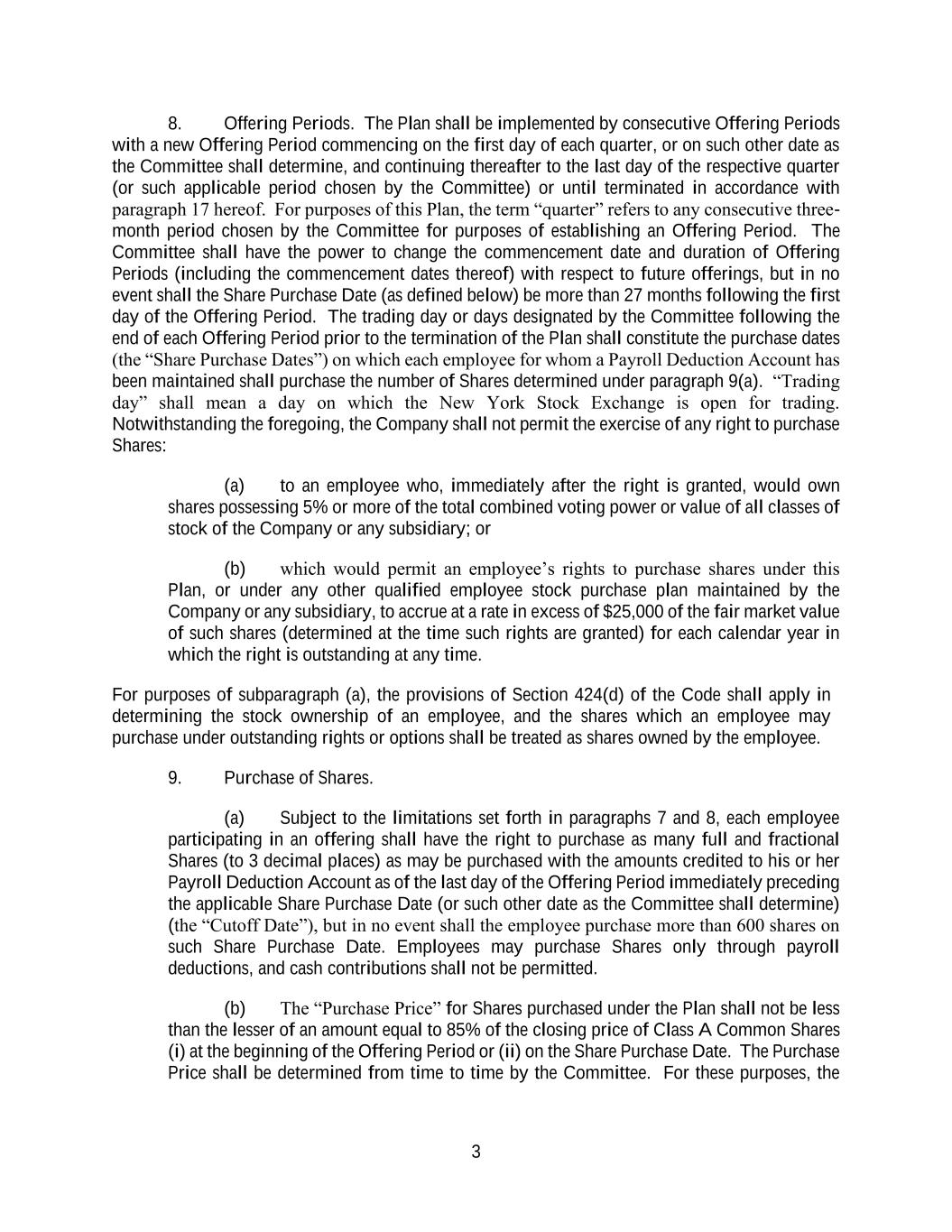 3 3. Recoupment of Erroneously Awarded Compensation. Upon the occurrence of a Restatement Trigger Date, the Company shall recoup Erroneously Awarded Compensation reasonably promptly, in the manner described below. For the avoidance of doubt, the Company’s obligation to recover Erroneously Awarded Compensation under this Policy is not dependent on if or when restated financial statements are filed following the Restatement Trigger Date. (a) Process. The Compensation Committee shall use the following process for recoupment: (i) First, the Compensation Committee will determine the amount of any Erroneously Awarded Compensation for each Covered Executive in connection with such Accounting Restatement. For Incentive-Based Compensation based on (or derived from) stock price or total shareholder return where the amount of Erroneously Awarded Compensation is not subject to mathematical recalculation directly from the information in the applicable Accounting Restatement, the amount shall be determined by the Compensation Committee based on a reasonable estimate of the effect of the Accounting Restatement on the stock price or total shareholder return upon which the Incentive-Based Compensation was Received (in which case, the Company shall maintain documentation of such determination of that reasonable estimate and provide such documentation to the NYSE). (ii) Second, the Compensation Committee will provide each affected Covered Executive with a written notice stating the amount of the Erroneously Awarded Compensation, a demand for recoupment, and the means of recoupment that the Company will accept. (b) Means of Recoupment. The Compensation Committee shall have discretion to determine the appropriate means of recoupment of Erroneously Awarded Compensation, which may include without limitation: (i) recoupment of cash or shares of Company stock, (ii) forfeiture of unvested cash or equity awards (including those subject to service-based and/or performance- based vesting conditions), (iii) cancellation of outstanding vested cash or equity awards (including those for which service-based and/or performance-based vesting conditions have been satisfied), (iv) to the extent consistent with Section 409A of the Code, offset of other amounts owed to the Covered Executive or forfeiture of deferred compensation, (v) reduction of future compensation, and (vi) any other remedial or recovery action permitted by law. Notwithstanding the foregoing, the Company Group makes no guarantee as to the treatment of such amounts under Section 409A of the Code and shall have no liability with respect thereto. Except as set forth in Section 3(d) below, in no event may the Company Group accept an amount that is less than the amount of Erroneously Awarded Compensation in satisfaction of a Covered Executive’s obligations hereunder. (c) Failure to Repay. To the extent that a Covered Executive fails to repay all Erroneously Awarded Compensation to the Company Group when due (as determined in accordance with Section 3(a) above), the Company shall, or shall cause one or more other members of the Company Group to, take all actions reasonable and appropriate to recoup such Erroneously Awarded Compensation from the applicable Covered Executive. The applicable Covered Executive shall be required to reimburse the Company Group for any and all expenses reasonably incurred (including legal fees) by the Company Group in recouping such Erroneously Awarded Compensation in accordance with the immediately preceding sentence. (d) Exceptions. Notwithstanding anything herein to the contrary, the Company shall not be required to recoup Erroneously Awarded Compensation if one of the following conditions is met and the Compensation Committee determines that recoupment would be impracticable: (i) The direct expense paid to a third party to assist in enforcing this Policy against a Covered Executive would exceed the amount to be recouped, after the Company has