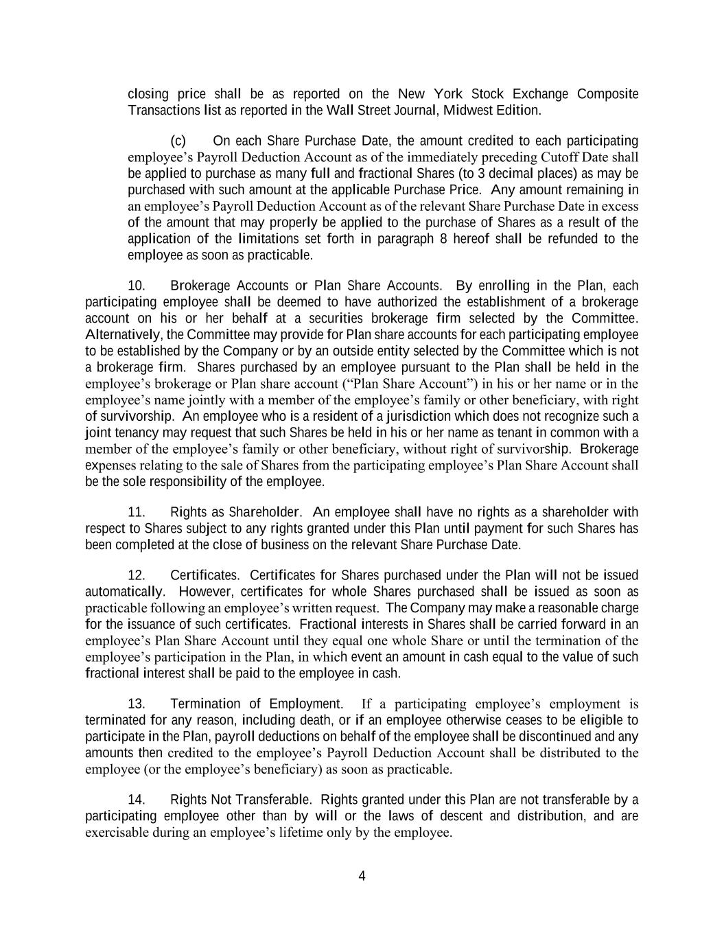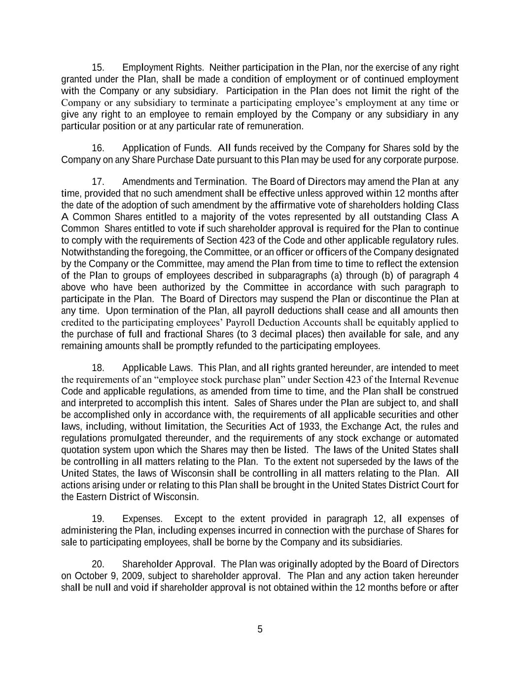 5 Wisconsin located in the county in which the Company’s principal executive offices are located or, if such court declines to exercise jurisdiction or if subject matter jurisdiction over the matter that is the subject of any such legal action or proceeding is vested exclusively in the U.S. federal courts, the U.S. District Court for the Eastern District of Wisconsin. 11. Exhibit Filing Requirement. This Policy and any amendments hereto shall be posted on the Company’s website and filed as an exhibit to the Company’s annual report on Form 10-K. 12. Severability. The provisions in this Policy are intended to be applied to the fullest extent of the law. To the extent that any provision of this Policy is found to be unenforceable or invalid under any applicable law, such provision shall be applied to the maximum extent permitted and shall automatically be deemed amended in a manner consistent with its objectives to the extent necessary to conform to any limitations required under applicable law.