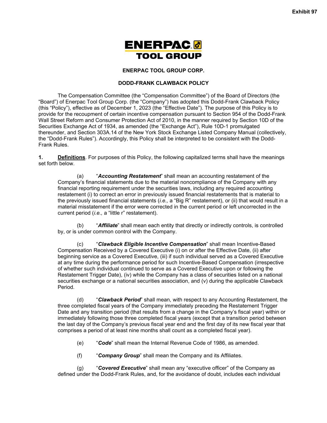 ENERPAC TOOL GROUP CORP. DODD-FRANK CLAWBACK POLICY The Compensation Committee (the “Compensation Committee”) of the Board of Directors (the “Board”) of Enerpac Tool Group Corp. (the “Company”) has adopted this Dodd-Frank Clawback Policy (this “Policy”), effective as of December 1, 2023 (the “Effective Date”). The purpose of this Policy is to provide for the recoupment of certain incentive compensation pursuant to Section 954 of the Dodd-Frank Wall Street Reform and Consumer Protection Act of 2010, in the manner required by Section 10D of the Securities Exchange Act of 1934, as amended (the “Exchange Act”), Rule 10D-1 promulgated thereunder, and Section 303A.14 of the New York Stock Exchange Listed Company Manual (collectively, the “Dodd-Frank Rules”). Accordingly, this Policy shall be interpreted to be consistent with the Dodd- Frank Rules. 1. Definitions. For purposes of this Policy, the following capitalized terms shall have the meanings set forth below. (a) “Accounting Restatement” shall mean an accounting restatement of the Company’s financial statements due to the material noncompliance of the Company with any financial reporting requirement under the securities laws, including any required accounting restatement (i) to correct an error in previously issued financial restatements that is material to the previously issued financial statements (i.e., a “Big R” restatement), or (ii) that would result in a material misstatement if the error were corrected in the current period or left uncorrected in the current period (i.e., a “little r” restatement). (b) “Affiliate” shall mean each entity that directly or indirectly controls, is controlled by, or is under common control with the Company. (c) “Clawback Eligible Incentive Compensation” shall mean Incentive-Based Compensation Received by a Covered Executive (i) on or after the Effective Date, (ii) after beginning service as a Covered Executive, (iii) if such individual served as a Covered Executive at any time during the performance period for such Incentive-Based Compensation (irrespective of whether such individual continued to serve as a Covered Executive upon or following the Restatement Trigger Date), (iv) while the Company has a class of securities listed on a national securities exchange or a national securities association, and (v) during the applicable Clawback Period. (d) “Clawback Period” shall mean, with respect to any Accounting Restatement, the three completed fiscal years of the Company immediately preceding the Restatement Trigger Date and any transition period (that results from a change in the Company’s fiscal year) within or immediately following those three completed fiscal years (except that a transition period between the last day of the Company’s previous fiscal year end and the first day of its new fiscal year that comprises a period of at least nine months shall count as a completed fiscal year). (e) “Code” shall mean the Internal Revenue Code of 1986, as amended. (f) “Company Group” shall mean the Company and its Affiliates. (g) “Covered Executive” shall mean any “executive officer” of the Company as defined under the Dodd-Frank Rules, and, for the avoidance of doubt, includes each individual Exhibit 97