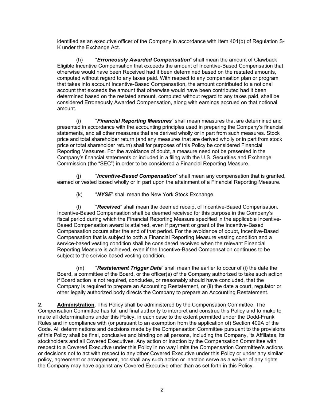 2 identified as an executive officer of the Company in accordance with Item 401(b) of Regulation S- K under the Exchange Act. (h) “Erroneously Awarded Compensation” shall mean the amount of Clawback Eligible Incentive Compensation that exceeds the amount of Incentive-Based Compensation that otherwise would have been Received had it been determined based on the restated amounts, computed without regard to any taxes paid. With respect to any compensation plan or program that takes into account Incentive-Based Compensation, the amount contributed to a notional account that exceeds the amount that otherwise would have been contributed had it been determined based on the restated amount, computed without regard to any taxes paid, shall be considered Erroneously Awarded Compensation, along with earnings accrued on that notional amount. (i) “Financial Reporting Measures” shall mean measures that are determined and presented in accordance with the accounting principles used in preparing the Company’s financial statements, and all other measures that are derived wholly or in part from such measures. Stock price and total shareholder return (and any measures that are derived wholly or in part from stock price or total shareholder return) shall for purposes of this Policy be considered Financial Reporting Measures. For the avoidance of doubt, a measure need not be presented in the Company’s financial statements or included in a filing with the U.S. Securities and Exchange Commission (the “SEC”) in order to be considered a Financial Reporting Measure. (j) “Incentive-Based Compensation” shall mean any compensation that is granted, earned or vested based wholly or in part upon the attainment of a Financial Reporting Measure. (k) “NYSE” shall mean the New York Stock Exchange. (l) “Received” shall mean the deemed receipt of Incentive-Based Compensation. Incentive-Based Compensation shall be deemed received for this purpose in the Company’s fiscal period during which the Financial Reporting Measure specified in the applicable Incentive- Based Compensation award is attained, even if payment or grant of the Incentive-Based Compensation occurs after the end of that period. For the avoidance of doubt, Incentive-Based Compensation that is subject to both a Financial Reporting Measure vesting condition and a service-based vesting condition shall be considered received when the relevant Financial Reporting Measure is achieved, even if the Incentive-Based Compensation continues to be subject to the service-based vesting condition. (m) “Restatement Trigger Date” shall mean the earlier to occur of (i) the date the Board, a committee of the Board, or the officer(s) of the Company authorized to take such action if Board action is not required, concludes, or reasonably should have concluded, that the Company is required to prepare an Accounting Restatement, or (ii) the date a court, regulator or other legally authorized body directs the Company to prepare an Accounting Restatement. 2. Administration. This Policy shall be administered by the Compensation Committee. The Compensation Committee has full and final authority to interpret and construe this Policy and to make to make all determinations under this Policy, in each case to the extent permitted under the Dodd-Frank Rules and in compliance with (or pursuant to an exemption from the application of) Section 409A of the Code. All determinations and decisions made by the Compensation Committee pursuant to the provisions of this Policy shall be final, conclusive and binding on all persons, including the Company, its Affiliates, its stockholders and all Covered Executives. Any action or inaction by the Compensation Committee with respect to a Covered Executive under this Policy in no way limits the Compensation Committee’s actions or decisions not to act with respect to any other Covered Executive under this Policy or under any similar policy, agreement or arrangement, nor shall any such action or inaction serve as a waiver of any rights the Company may have against any Covered Executive other than as set forth in this Policy.