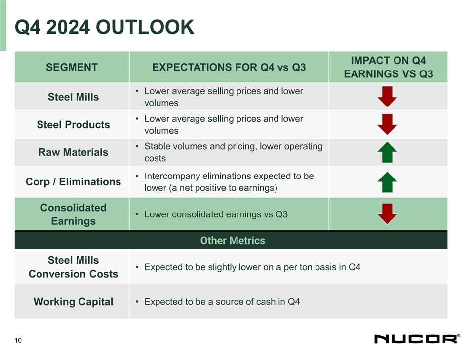 Q3 SEGMENT RESULTS Q3 2024 SEGMENT RESULTS VS PRIOR (1) PRE-TAX SEGMENT EARNINGS QUARTER (millions) $71 • Lower avg selling price $10 STEEL • Lower volumes $512 MILLS $807 • 51% lower EBT/ton $39 $656 $441 • Lower avg selling price STEEL • Lower volumes $1,102 $314 PRODUCTS $883 • Includes $40M Impairment $588 $645 $309 ($14) ($66) ($151) ($213) ($228) • Lower avg selling price ($168) ($398) RAW • Lower volumes MATERIALS • Includes $83M Impairment Q3 2023 Q4 2023 Q1 2024 Q2 2024 Q3 2024 Steel Mills Steel Products Raw Materials Corporate/Eliminations (1) Total segment earnings before income taxes and non-controlling interests 9