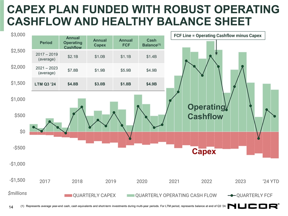 BALANCE SHEET & CAPITAL ALLOCATION 26% SHARECOUNT REDUCTION SINCE 2017 COMMITTED TO A STRONG BALANCE SHEET Shares rounded to closest million xLTM $USD in millions 318 1 as of September 28, 2024 Amount EBITDA % cap Total Debt 6,939 ~1.4x 24% 235 Cash and Cash Equivalents 4,858 Net Debt 2,081 ~0.4x Total Equity & Non-Controlling Int. 21,557 76% Total Book Capitalization 28,496 100% 2017 2019 2021 2023 Q3 2024 RETURNS TO SHAREHOLDERS (2020 – Q3 2024) CASH RETURNS RETURNS AS A % OF NET EARNINGS 132% ✓ Committed to at least 40% of annual net earnings DIVIDENDS returned to Nucor shareholders $2.4 74% 55% ~$12B 46% 43% 40% SHARE REPURCHASES $9.5 2020 2021 2022 2023 2024 YTD 1 EBITDA is a non-GAAP financial measure. For a reconciliation of non-GAAP measures, please refer to the Appendix. 13 2 Long-Term Debt includes Current Portion of Long-Term Debt and Finance Lease Obligations