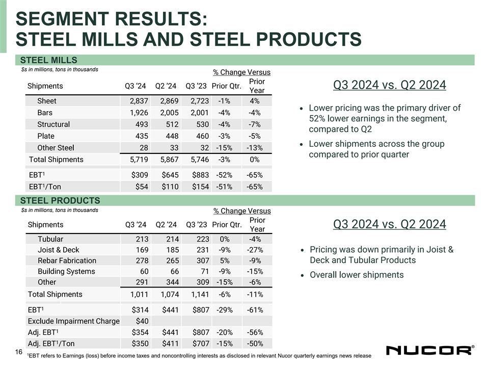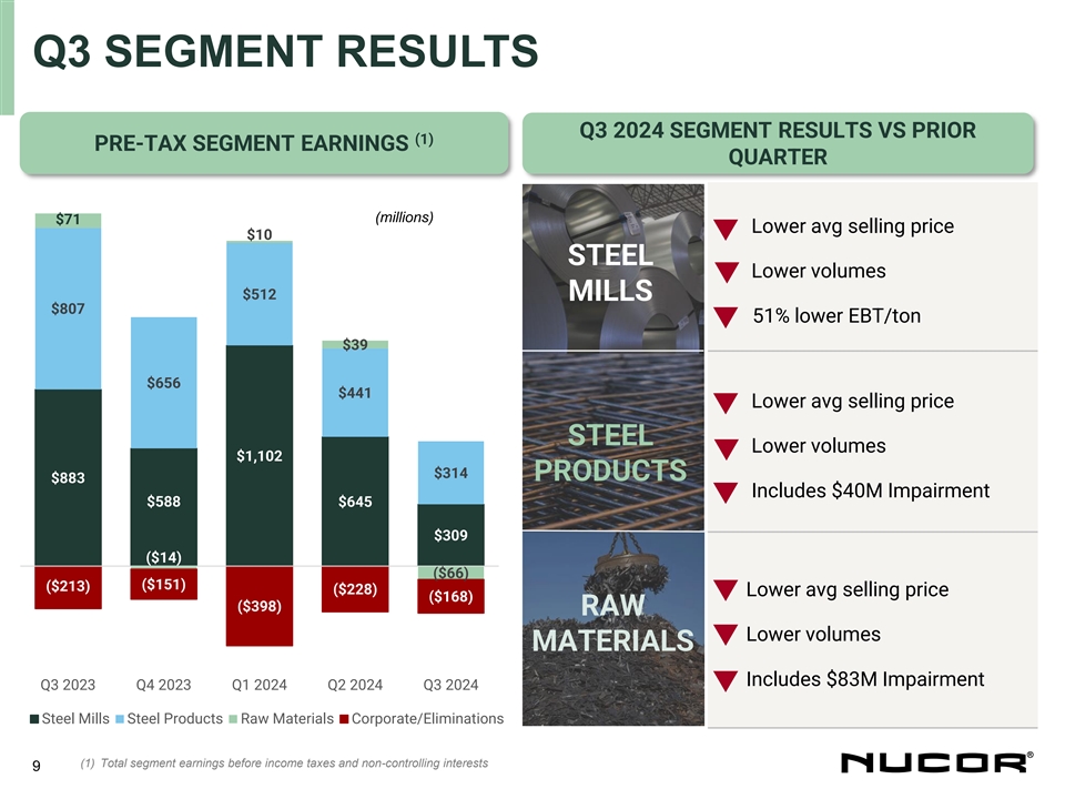 The largest driver for the decrease in earnings in the third quarter of 2024 as compared to the second quarter of 2024 is the decreased earnings of the steel mills segment, due primarily to lower average selling prices. The steel products segments earnings decreased in the third quarter of 2024 as compared to the second quarter of 2024 due to lower average selling prices and lower volumes. Earnings in the raw materials segment are lower in the third quarter of 2024 as compared to the second quarter of 2024 due primarily to the non-cash impairment charge taken in the third quarter of 2024.