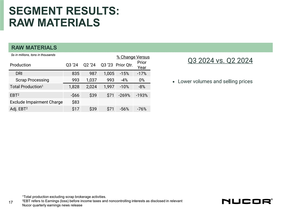 SEGMENT RESULTS: STEEL MILLS AND STEEL PRODUCTS STEEL MILLS $s in millions, tons in thousands % Change Versus Prior Shipments Q3 ‘24 Q2 ’24 Q3 ’23 Prior Qtr. Q3 2024 vs. Q2 2024 Year Sheet 2,837 2,869 2,723 -1% 4% • Lower pricing was the primary driver of Bars 1,926 2,005 2,001 -4% -4% 52% lower earnings in the segment, Structural 493 512 530 -4% -7% compared to Q2 Plate 435 448 460 -3% -5% • Lower shipments across the group Other Steel 28 33 32 -15% -13% compared to prior quarter Total Shipments 5,719 5,867 5,746 -3% 0% 1 EBT $309 $645 $883 -52% -65% 1 EBT /Ton $54 $110 $154 -51% -65% STEEL PRODUCTS $s in millions, tons in thousands % Change Versus Prior Shipments Q3 ‘24 Q2 ’24 Q3 ’23 Prior Qtr. Q3 2024 vs. Q2 2024 Year Tubular 213 214 223 0% -4% • Joist & Deck 169 185 231 -9% -27% Pricing was down primarily in Joist & Rebar Fabrication 278 265 307 5% -9% Deck and Tubular Products Building Systems 60 66 71 -9% -15% • Overall lower shipments Other 291 344 309 -15% -6% Total Shipments 1,011 1,074 1,141 -6% -11% 1 EBT $314 $441 $807 -29% -61% Exclude Impairment Charge $40 1 Adj. EBT $354 $441 $807 -20% -56% 1 Adj. EBT /Ton $350 $411 $707 -15% -50% 16 1 EBT refers to Earnings (loss) before income taxes and noncontrolling interests as disclosed in relevant Nucor quarterly earnings news release