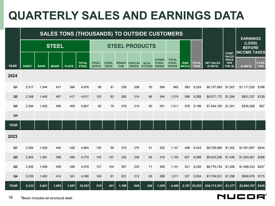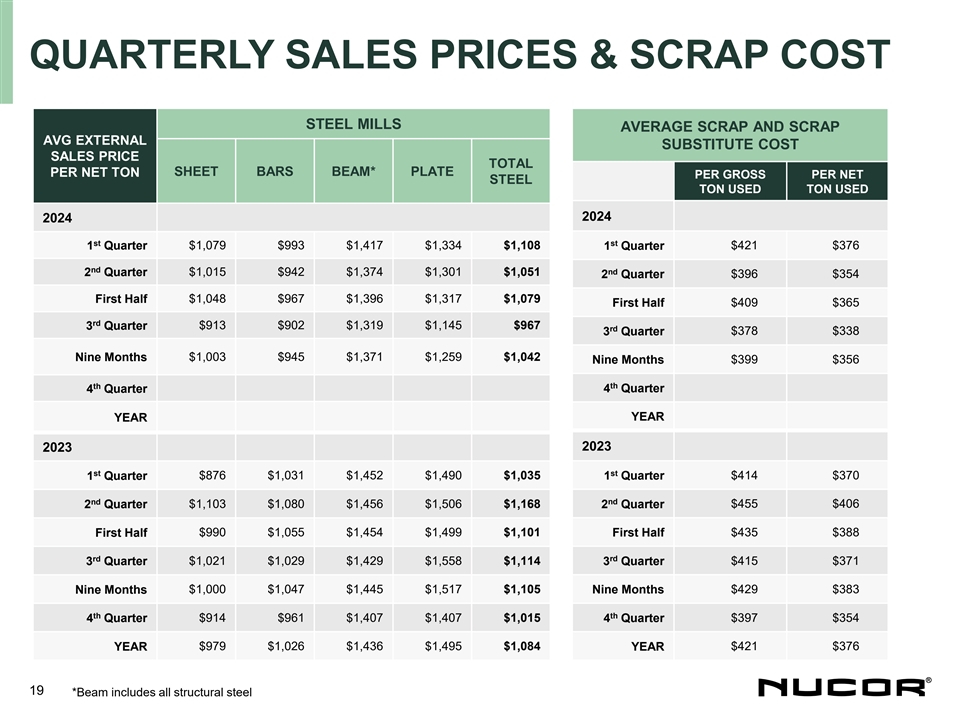 QUARTERLY SALES AND EARNINGS DATA SALES TONS (THOUSANDS) TO OUTSIDE CUSTOMERS EARNINGS (LOSS) STEEL STEEL PRODUCTS BEFORE INCOME TAXES COMP. SALES OTHER TOTAL PRICE TOTAL STEEL STEEL REBAR TUBULAR BLDG STEEL STEEL RAW TOTAL NET SALES PER $ PER YEAR SHEET BARS BEAM* PLATE STEEL JOISTS DECK FAB PRODS SYSTEMS PRODS PRODS MATLS TONS ($ 000’S) TON ($) ($ 000’S) TON 2024 Q1 2,517 1,344 431 384 4,676 99 81 238 208 55 284 965 583 6,224 $8,137,083 $1,307 $1,111,220 $188 Q2 2,348 1,445 407 417 4,617 103 82 265 214 66 344 1,074 598 6,289 $8,077,172 $1,284 $831,237 $139 Q3 2,394 1,402 406 405 4,607 90 79 278 213 60 291 1,011 578 6,196 $7,444,160 $1,201 $335,358 $57 Q4 YEAR 2023 Q1 2,384 1,550 440 430 4,804 135 99 279 275 51 302 1,141 498 6,443 $8,709,980 $1,352 $1,501,697 $244 Q2 2,404 1,481 399 490 4,774 142 107 332 239 63 310 1,193 621 6,588 $9,523,256 $1,446 $1,924,061 $306 Q3 2,305 1,408 439 426 4,578 127 104 307 223 71 309 1,141 521 6,240 $8,775,734 $1,406 $1,468,333 $247 Q4 2,239 1,402 414 341 4,396 106 91 251 212 63 288 1,011 527 5,934 $7,704,531 $1,298 $990,676 $175 YEAR 9,332 5,841 1,692 1,687 18,552 510 401 1,169 949 248 1,209 4,486 2,167 25,205 $34,713,501 $1,377 $5,884,767 $245 18 *Beam includes all structural steel