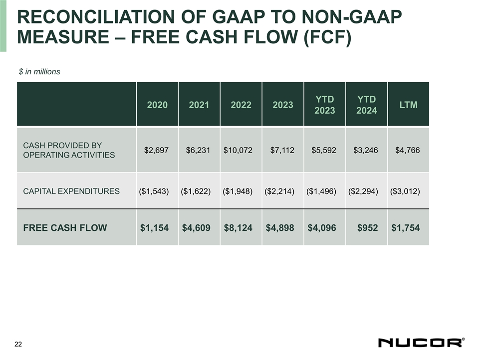 RECONCILIATION OF GAAP TO NON-GAAP MEASURE – FREE CASH FLOW (FCF) $ in millions YTD YTD 2020 2021 2022 2023 LTM 2023 2024 CASH PROVIDED BY $2,697 $6,231 $10,072 $7,112 $5,592 $3,246 $4,766 OPERATING ACTIVITIES CAPITAL EXPENDITURES ($1,543) ($1,622) ($1,948) ($2,214) ($1,496) ($2,294) ($3,012) FREE CASH FLOW $1,154 $4,609 $8,124 $4,898 $4,096 $952 $1,754 22