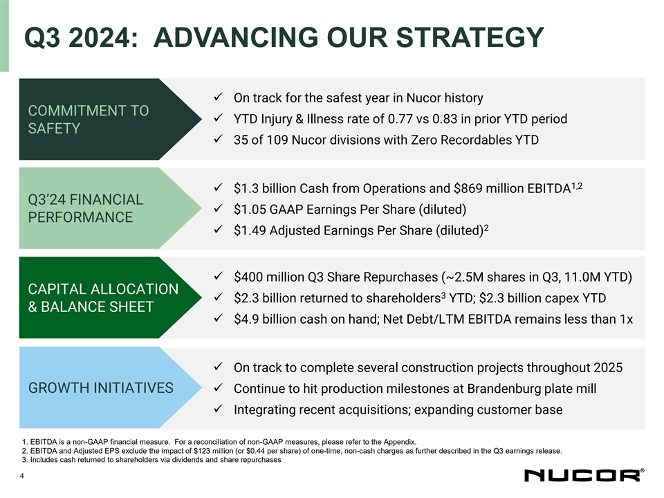 FORWARD-LOOKING STATEMENTS Certain statements made in this presentation may constitute forward-looking statements within the meaning of the Private Securities Litigation Reform Act of 1995. These statements involve risks and uncertainties. The words “anticipate,” “believe,” “expect,” “intend,” “may,” “project,” “will,” “should,” “could” and similar expressions are intended to identify forward-looking statements. These forward-looking statements reflect the Company’s best judgment based on current information, and although we base these statements on circumstances that we believe to be reasonable when made, there can be no assurance that future events will not affect the accuracy of such forward-looking information. The Company does not undertake any obligation to update these statements. The forward-looking statements are not guarantees of future performance, and actual results may vary materially from the projected results and expectations discussed in this presentation. Factors that might cause the Company’s actual results to differ materially from those anticipated in forward- looking statements include, but are not limited to: (1) competitive pressure on sales and pricing, including pressure from imports and substitute materials; (2) U.S. and foreign trade policies affecting steel imports or exports; (3) the sensitivity of the results of our operations to general market conditions, and in particular, prevailing market steel prices and changes in the supply and cost of raw materials, including pig iron, iron ore and scrap steel; (4) the availability and cost of electricity and natural gas, which could negatively affect our cost of steel production or result in a delay or cancellation of existing or future drilling within our natural gas drilling programs; (5) critical equipment failures and business interruptions; (6) market demand for steel products, which, in the case of many of our products, is driven by the level of nonresidential construction activity in the United States; (7) impairment in the recorded value of inventory, equity investments, fixed assets, goodwill or other long- lived assets; (8) uncertainties and volatility surrounding the global economy, including excess world capacity for steel production, inflation and interest rate changes; (9) fluctuations in currency conversion rates; (10) significant changes in laws or government regulations affecting environmental compliance, including legislation and regulations that result in greater regulation of greenhouse gas emissions that could increase our energy costs, capital expenditures and operating costs or cause one or more of our permits to be revoked or make it more difficult to obtain permit modifications; (11) the cyclical nature of the steel industry; (12) capital investments and their impact on our performance; (13) our safety performance; (14) our ability to integrate businesses we acquire; (15) the impact of the COVID-19 pandemic, any variants of the virus, and any other similar public health situation; and (16) the risks discussed in “Item 1A. Risk Factors” of the Company’s Annual Report on Form 10-K for the year ended December 31, 2023 and elsewhere therein and in the other reports we file with the U.S. Securities and Exchange Commission. 2