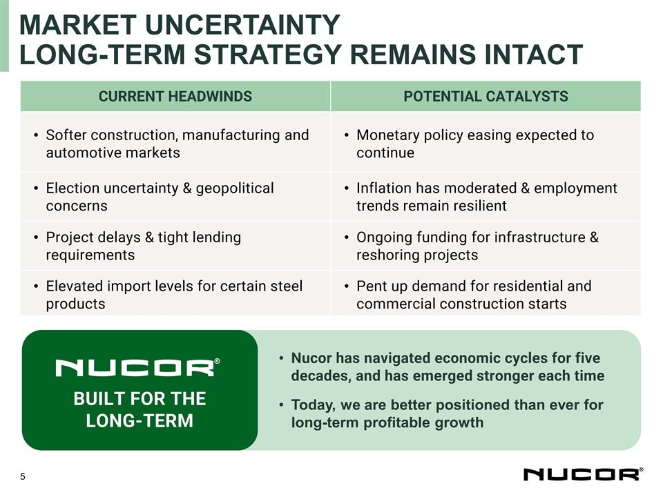 Q3 2024: ADVANCING OUR STRATEGY ✓ On track for the safest year in Nucor history COMMITMENT TO ✓ YTD Injury & Illness rate of 0.77 vs 0.83 in prior YTD period SAFETY ✓ 35 of 109 Nucor divisions with Zero Recordables YTD 1,2 ✓ $1.3 billion Cash from Operations and $869 million EBITDA Q3’24 FINANCIAL ✓ $1.05 GAAP Earnings Per Share (diluted) PERFORMANCE 2 ✓ $1.49 Adjusted Earnings Per Share (diluted) ✓ $400 million Q3 Share Repurchases (~2.5M shares in Q3, 11.0M YTD) CAPITAL ALLOCATION 3 ✓ $2.3 billion returned to shareholders YTD; $2.3 billion capex YTD & BALANCE SHEET ✓ $4.9 billion cash on hand; Net Debt/LTM EBITDA remains less than 1x ✓ On track to complete several construction projects throughout 2025 GROWTH INITIATIVES✓ Continue to hit production milestones at Brandenburg plate mill ✓ Integrating recent acquisitions; expanding customer base 1. EBITDA is a non-GAAP financial measure. For a reconciliation of non-GAAP measures, please refer to the Appendix. 2. EBITDA and Adjusted EPS exclude the impact of $123 million (or $0.44 per share) of one-time, non-cash charges as further described in the Q3 earnings release. 3. Includes cash returned to shareholders via dividends and share repurchases 4