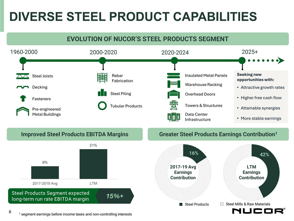 MARKET UNCERTAINTY LONG-TERM STRATEGY REMAINS INTACT CURRENT HEADWINDS POTENTIAL CATALYSTS • Softer construction, manufacturing and • Monetary policy easing expected to automotive markets continue • Election uncertainty & geopolitical • Inflation has moderated & employment concerns trends remain resilient • Project delays & tight lending • Ongoing funding for infrastructure & requirements reshoring projects • Elevated import levels for certain steel • Pent up demand for residential and products commercial construction starts • Nucor has navigated economic cycles for five decades, and has emerged stronger each time BUILT FOR THE • Today, we are better positioned than ever for LONG-TERM long-term profitable growth 5