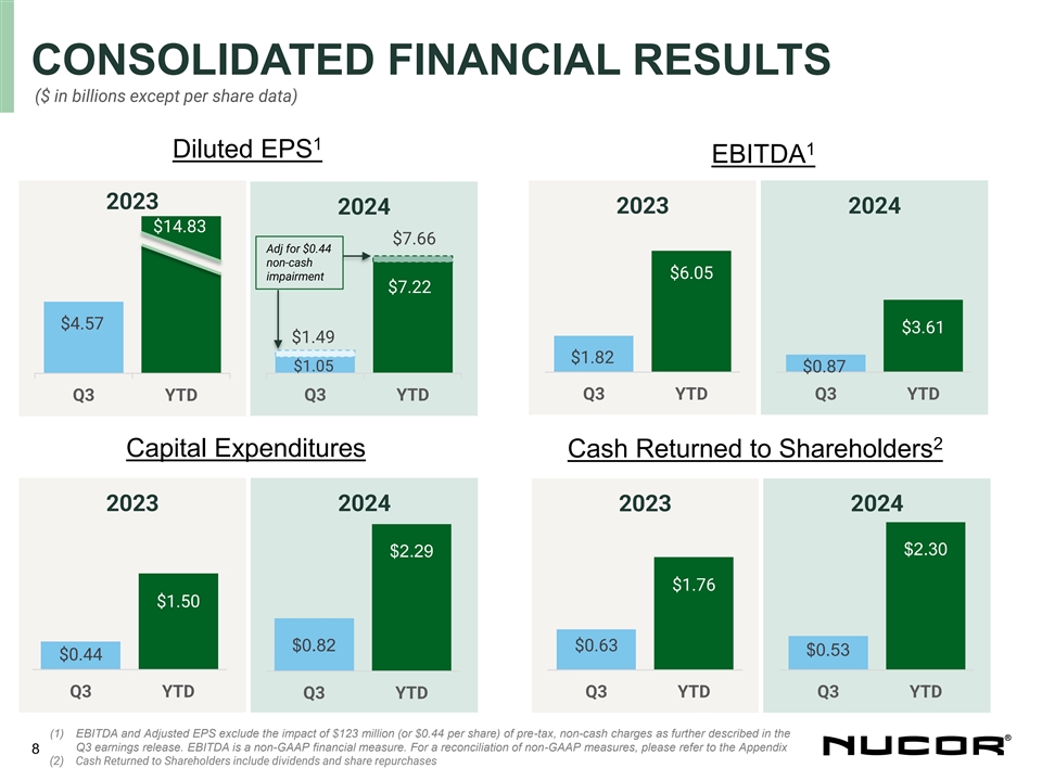 CHARLOTTE, N.C. October 21, 2024 - Nucor Corporation (NYSE: NUE) today announced consolidated net earnings attributable to Nucor stockholders of $249.9 million, or $1.05 per diluted share, for the third quarter of 2024. Excluding non-cash impairment charges taken during the quarter, Nucors third quarter of 2024 adjusted net earnings attributable to Nucor stockholders were $353.0 million, or $1.49 per diluted share. By comparison, Nucor reported consolidated net earnings attributable to Nucor stockholders of $645.2 million, or $2.68 per diluted share, for the second quarter of 2024 and $1.14 billion, or $4.57 per diluted share, for the third quarter of 2023.