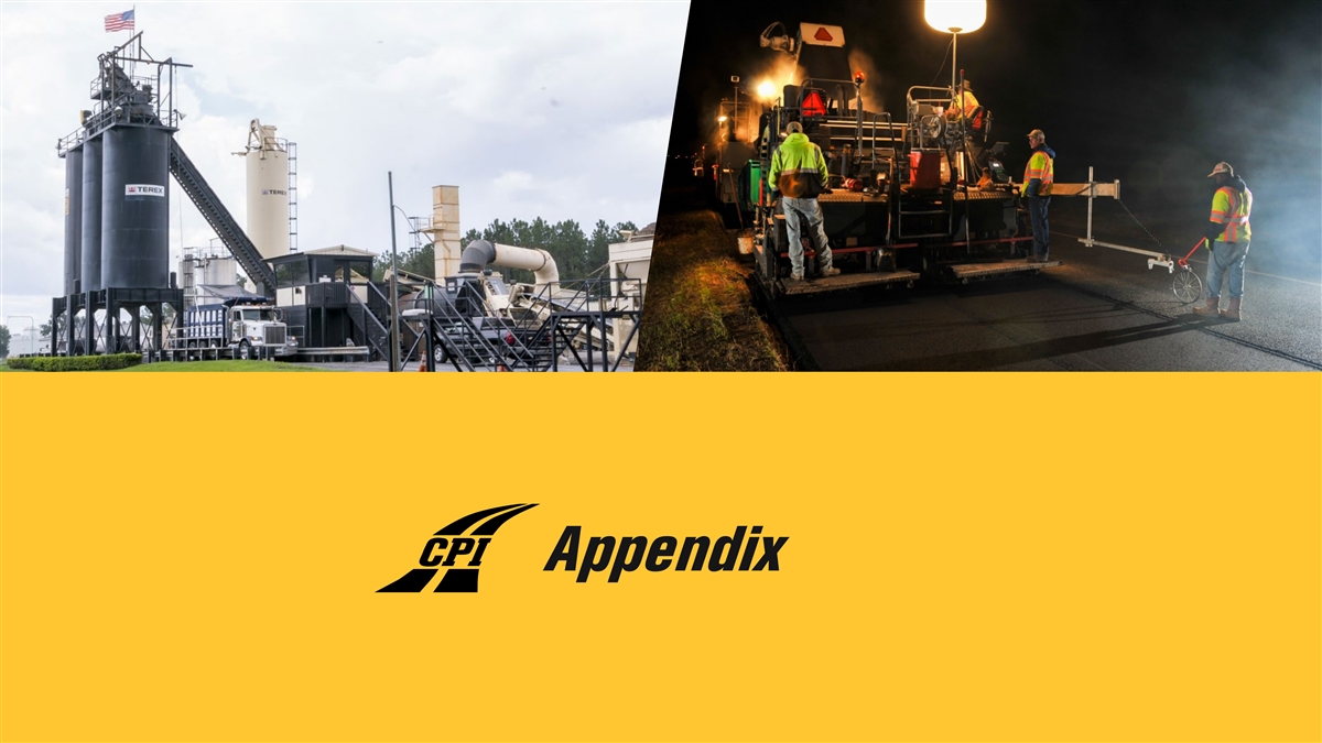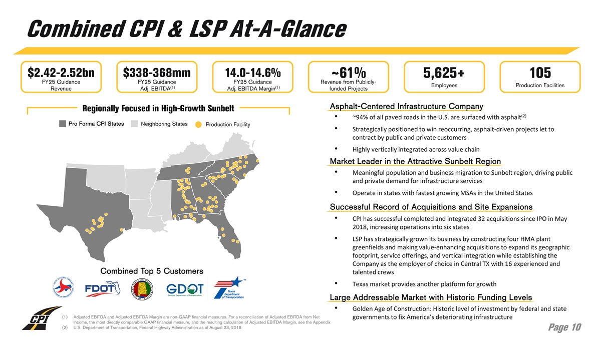 Combined CPI & LSP At-A-Glance $2.42-2.52bn $338-368mm 14.0-14.6% ~61% 5,625+ 105 FY25 Guidance FY25 Guidance FY25 Guidance Revenue from Publicly- Employees Production Facilities (1) (1) Revenue Adj. EBITDA Adj. EBITDA Margin funded Projects Asphalt-Centered Infrastructure Company Regionally Focused in High-Growth Sunbelt (2) • ~94% of all paved roads in the U.S. are surfaced with asphalt Pro Forma CPI States Neighboring States Production Facility • Strategically positioned to win reoccurring, asphalt-driven projects let to contract by public and private customers • Highly vertically integrated across value chain Market Leader in the Attractive Sunbelt Region • Meaningful population and business migration to Sunbelt region, driving public and private demand for infrastructure services • Operate in states with fastest growing MSAs in the United States Successful Record of Acquisitions and Site Expansions • CPI has successful completed and integrated 32 acquisitions since IPO in May 2018, increasing operations into six states • LSP has strategically grown its business by constructing four HMA plant greenfields and making value-enhancing acquisitions to expand its geographic footprint, service offerings, and vertical integration while establishing the Company as the employer of choice in Central TX with 16 experienced and Combined Top 5 Customers talented crews • Texas market provides another platform for growth Large Addressable Market with Historic Funding Levels • Golden Age of Construction: Historic level of investment by federal and state (1) Adjusted EBITDA and Adjusted EBITDA Margin are non-GAAP financial measures. For a reconciliation of Adjusted EBITDA from Net governments to fix America’s deteriorating infrastructure Income, the most directly comparable GAAP financial measure, and the resulting calculation of Adjusted EBITDA Margin, see the Appendix (2) U.S. Department of Transportation, Federal Highway Administration as of August 23, 2018 Page 10