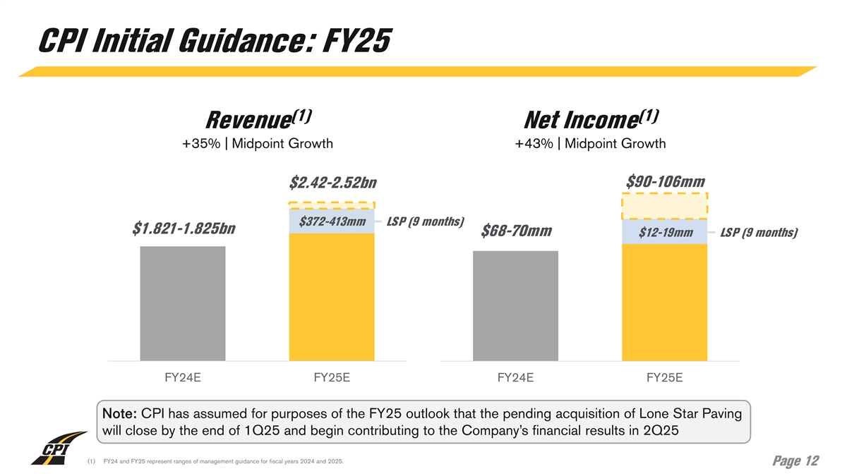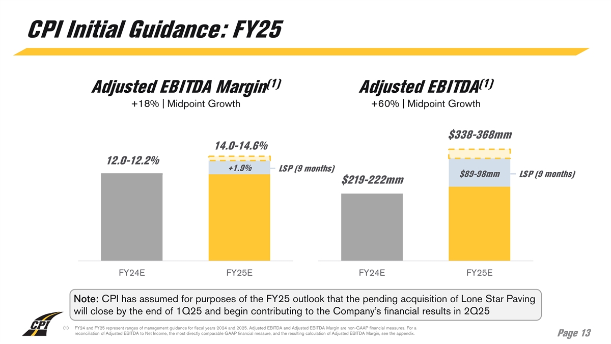 CPI Initial Guidance: FY25 (1) (1) Revenue Net Income +35% | Midpoint Growth +43% | Midpoint Growth $90-106mm $2.42-2.52bn $372-413mm LSP (9 months) $1.821-1.825bn $68-70mm $12-19mm LSP (9 months) FY24E FY25E FY24E FY25E Note: CPI has assumed for purposes of the FY25 outlook that the pending acquisition of Lone Star Paving will close by the end of 1Q25 and begin contributing to the Company’s financial results in 2Q25 (1) FY24 and FY25 represent ranges of management guidance for fiscal years 2024 and 2025. Page 12