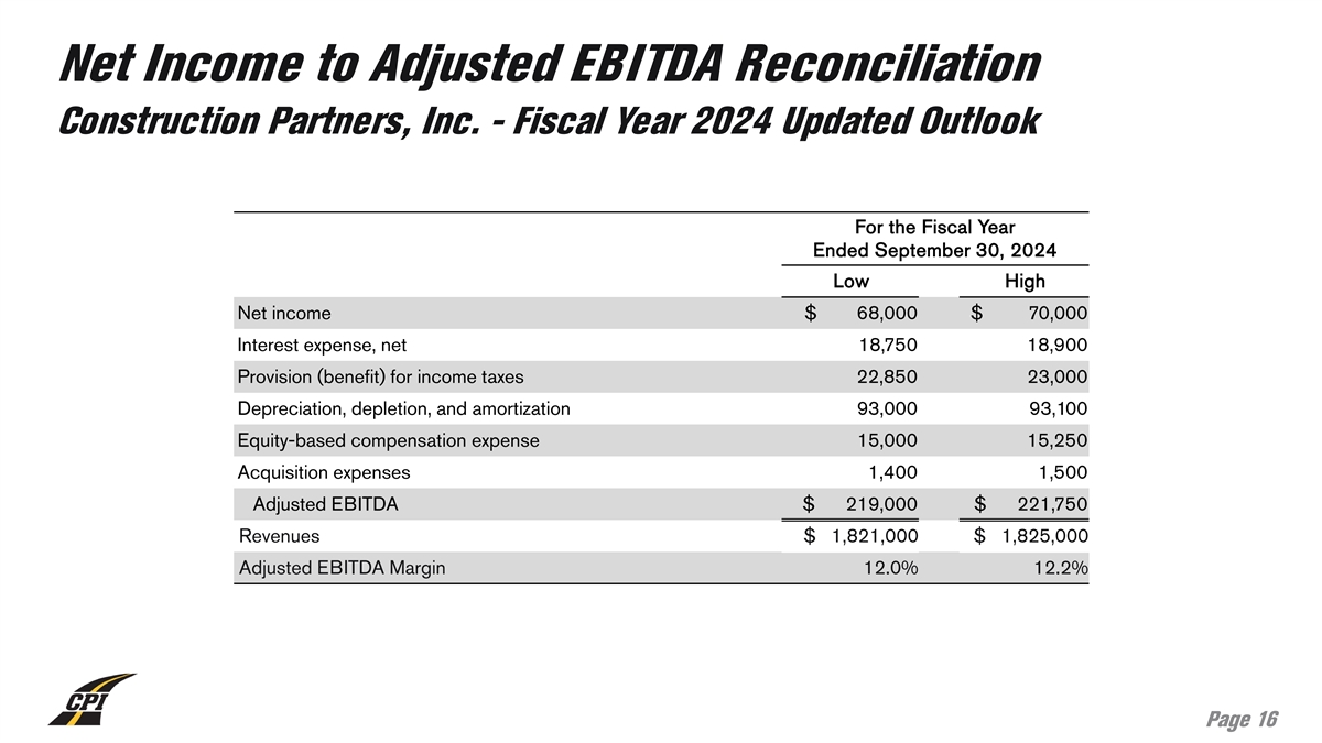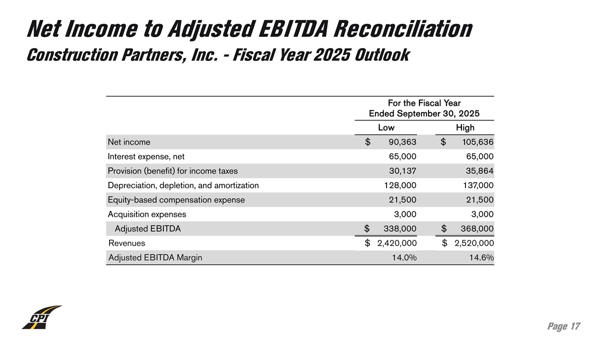 Net Income to Adjusted EBITDA Reconciliation Construction Partners, Inc. - Fiscal Year 2024 Updated Outlook For the Fiscal Year Ended September 30, 2024 Low High Net income $ 68,000 $ 70,000 Interest expense, net 18,750 18,900 Provision (benefit) for income taxes 22,850 23,000 Depreciation, depletion, and amortization 93,000 93,100 Equity-based compensation expense 15,000 15,250 Acquisition expenses 1,400 1,500 Adjusted EBITDA $ 219,000 $ 221,750 Revenues $ 1,821,000 $ 1,825,000 Adjusted EBITDA Margin 12.0% 12.2% Page 16