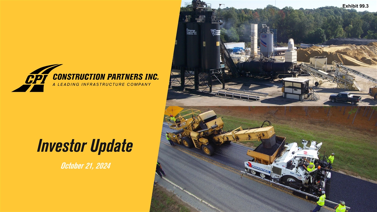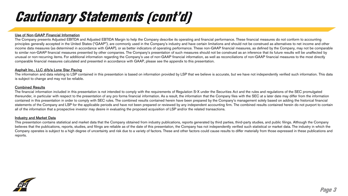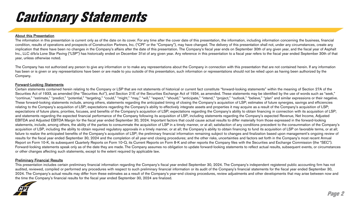 Cautionary Statements About this Presentation The information in this presentation is current only as of the date on its cover. For any time after the cover date of this presentation, the information, including information concerning the business, financial condition, results of operations and prospects of Construction Partners, Inc. (“CPI” or the “Company”), may have changed. The delivery of this presentation shall not, under any circumstances, create any implication that there have been no changes in the Company’s affairs after the date of this presentation. The Company’s fiscal year ends on September 30th of any given year, and the fiscal year of Asphalt Inc., LLC d/b/a Lone Star Paving (“LSP”) has historically ended on December 31st of any given year. Any reference in this presentation to a fiscal year refers to the fiscal year ended September 30th of that year, unless otherwise noted. The Company has not authorized any person to give any information or to make any representations about the Company in connection with this presentation that are not contained herein. If any information has been or is given or any representations have been or are made to you outside of this presentation, such information or representations should not be relied upon as having been authorized by the Company. Forward-Looking Statements Certain statements contained herein relating to the Company or LSP that are not statements of historical or current fact constitute “forward-looking statements” within the meaning of Section 27A of the Securities Act of 1933, as amended (the “Securities Act”), and Section 21E of the Securities Exchange Act of 1934, as amended. These statements may be identified by the use of words such as “seek,” “continue,” “estimate,” “predict,” “potential,” “targeting,” “could,” “might,” “may,” “will,” “expect,” “should,” “anticipate,” “intend,” “project,” “outlook,” “believe,” “plan” and similar expressions or their negative. These forward-looking statements include, among others, statements regarding the anticipated timing of closing the Company’s acquisition of LSP; estimates of future synergies, savings and efficiencies relating to the Company’s acquisition of LSP; expectations regarding the Company’s ability to effectively integrate assets and properties it may acquire as a result of the Company’s acquisition of LSP; expectations of future plans, priorities, focuses, and benefits of the Company’s acquisition of LSP; expectations regarding the Company’s ability to obtain financing in connection with its acquisition of LSP; and statements regarding the expected financial performance of the Company following its acquisition of LSP, including statements regarding the Company’s expected Revenue, Net Income, Adjusted EBITDA and Adjusted EBITDA Margin for the fiscal year ended September 30, 2024. Important factors that could cause actual results to differ materially from those expressed in the forward-looking statements, include, among others, the ability of the parties to consummate the acquisition of LSP in a timely manner, or at all; satisfaction of any conditions precedent to the consummation of the Company’s acquisition of LSP, including the ability to obtain required regulatory approvals in a timely manner, or at all; the Company’s ability to obtain financing to fund its acquisition of LSP on favorable terms, or at all; failure to realize the anticipated benefits of the Company’s acquisition of LSP; the preliminary financial information remaining subject to changes and finalization based upon management’s ongoing review of results for the fiscal year ended September 30, 2024 and the completion of all year-end closing procedures; and the other risks, uncertainties and factors set forth in the Company’s most recent Annual Report on Form 10-K, its subsequent Quarterly Reports on Form 10-Q, its Current Reports on Form 8-K and other reports the Company files with the Securities and Exchange Commission (the “SEC”). Forward-looking statements speak only as of the date they are made. The Company assumes no obligation to update forward-looking statements to reflect actual results, subsequent events, or circumstances or other changes affecting such statements, except to the extent required by applicable law. Preliminary Financial Results This presentation includes certain preliminary financial information regarding the Company’s fiscal year ended September 30, 2024. The Company’s independent registered public accounting firm has not audited, reviewed, compiled or performed any procedures with respect to such preliminary financial information or its audit of the Company’s financial statements for the fiscal year ended September 30, 2024. The Company’s actual results may differ from these estimates as a result of the Company’s year-end closing procedures, review adjustments and other developments that may arise between now and the time the Company’s financial results for the fiscal year ended September 30, 2024 are finalized. Page 2
